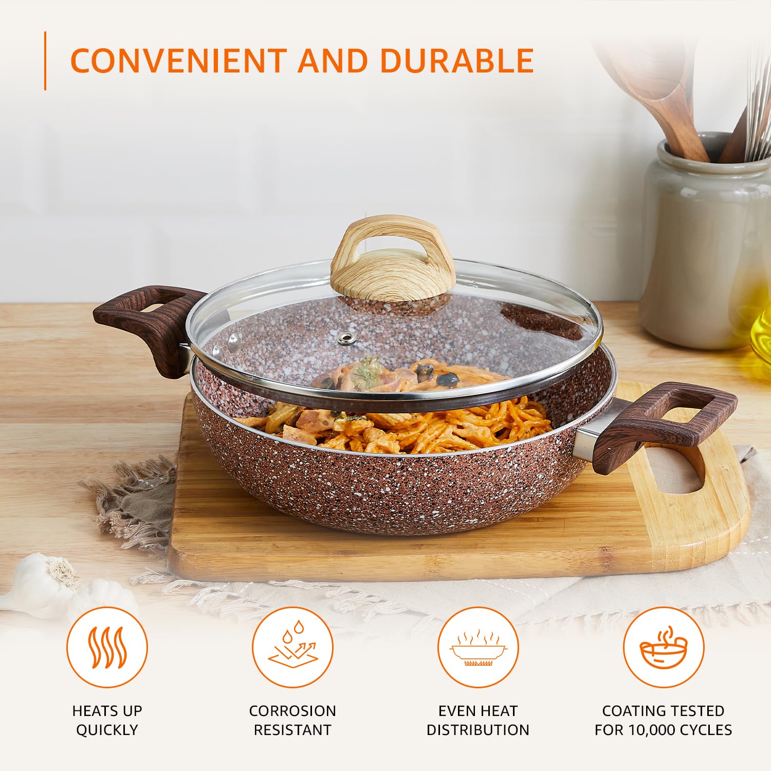 FAST, EVEN COOKING: Made from pressed aluminium, this cookware is ultra-conductive and corrosion-resistant. Its granite coating and flat, thick skillet bottom offer exceptional heat distribution to ensure even cooking and prevent hot spots. Overall, this cookware offers quick heating, thus using less energy.