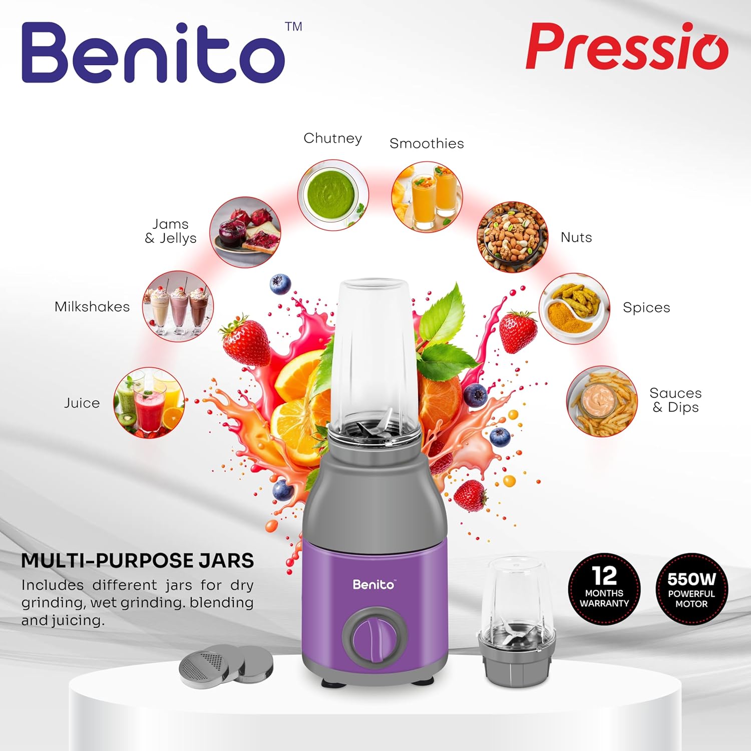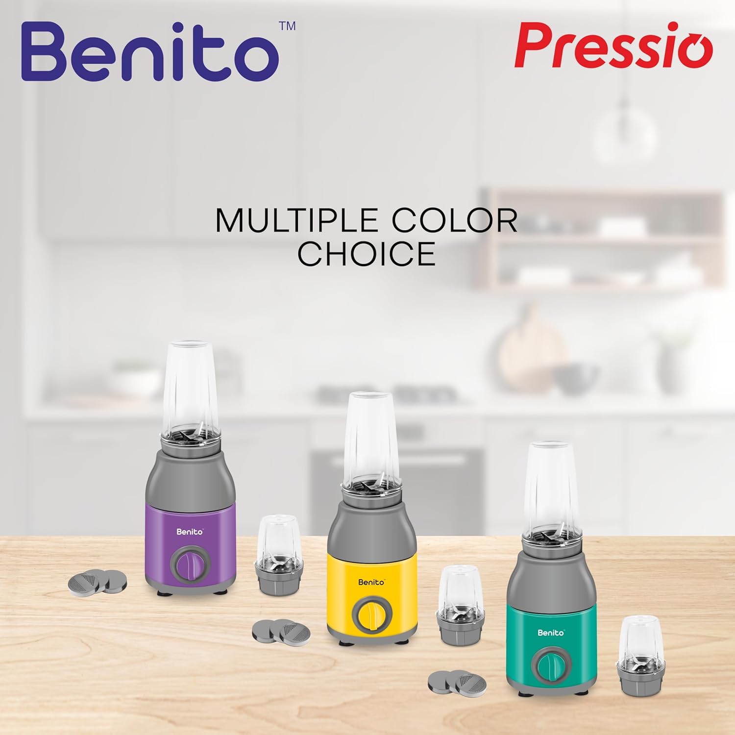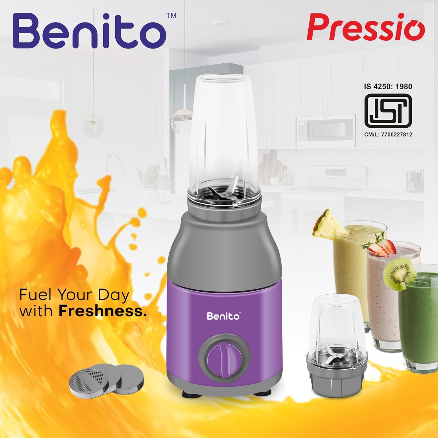 Benito is a dynamic brand committed to revolutionizing your kitchen with innovative and high-quality appliances. Specializing in efficient, stylish, and durable products, Benito strives to make everyday cooking tasks easier, faster, and more enjoyable, all while adding a touch of modern elegance to your home. The Benito PRESSIO Nutri Mixer 550W is the ultimate grind of power and style for your kitchen. With a robust 550W motor, it ensures fast and smooth performance, making it perfect for a variety of tasks such as smoothies, grinding chutneys, and making nut butters. The sharp, durable stainless steel blades provide precise results every time. Its sleek green and gray ABS body adds a modern touch to your kitchen while fitting seamlessly into any space. The transparent, unbreakable polycarbonate jars (500ml & 300ml) let you easily monitor the process, while their leakproof design ensures mess-free use. Designed for versatility, the Benito PRESSIO Nutri Mixer can handle everything from idli/dosa batter, soups, and sauces. It comes with three extra lids for convenient storage, making it the perfect tool for all your kitchen needs. Built-in overload protection and a safety interlock mechanism ensure safe and secure operation. Whether you’re an experienced chef or just starting out, the Benito PRESSIO Nutri Mixer is the perfect kitchen companion that combines performance, style, and convenience.