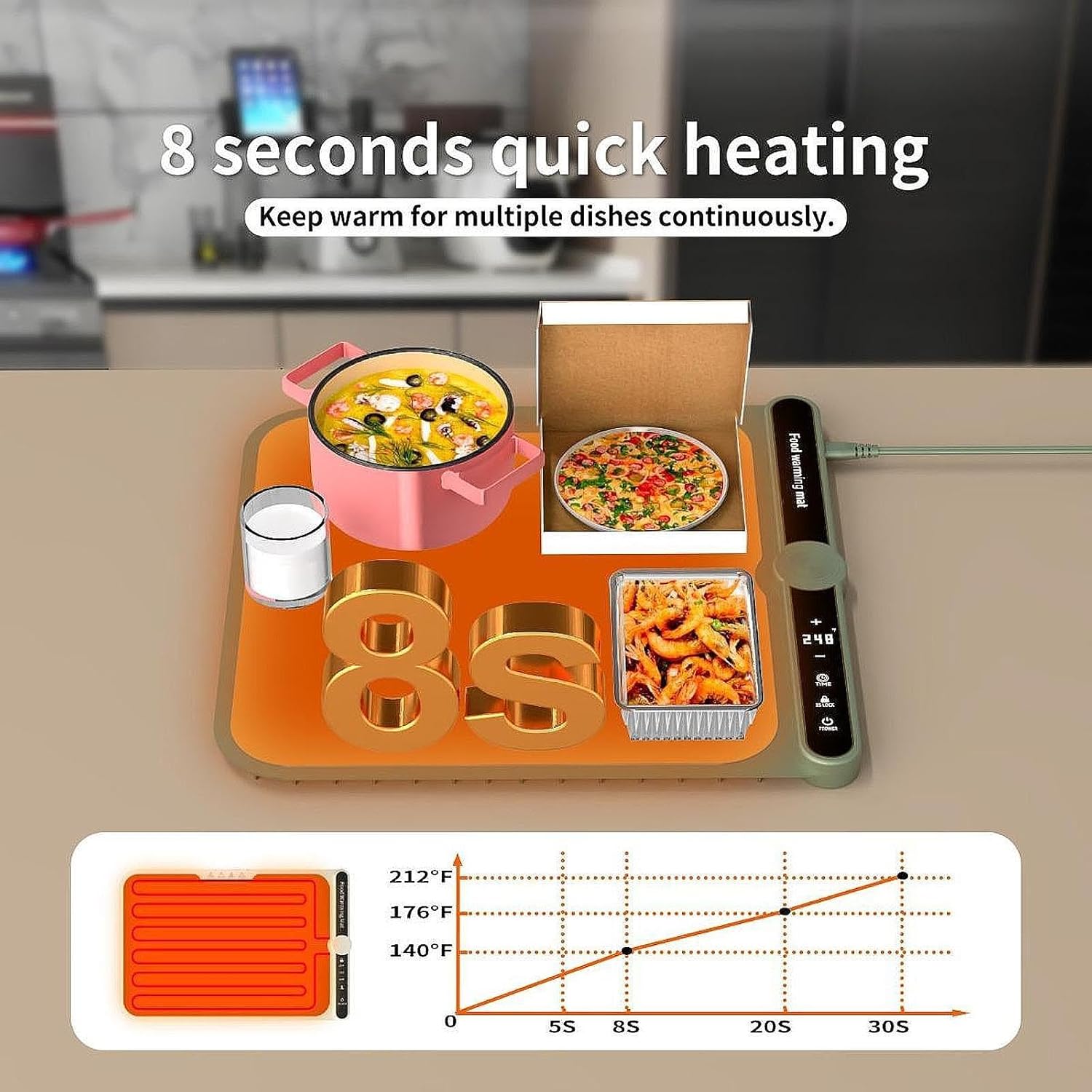 Temperature Control‘: The foot heating pad offers nine adjustable temperature settings ranging from 40°C to 120°C, allowing you to keep your food at the great serving temperature