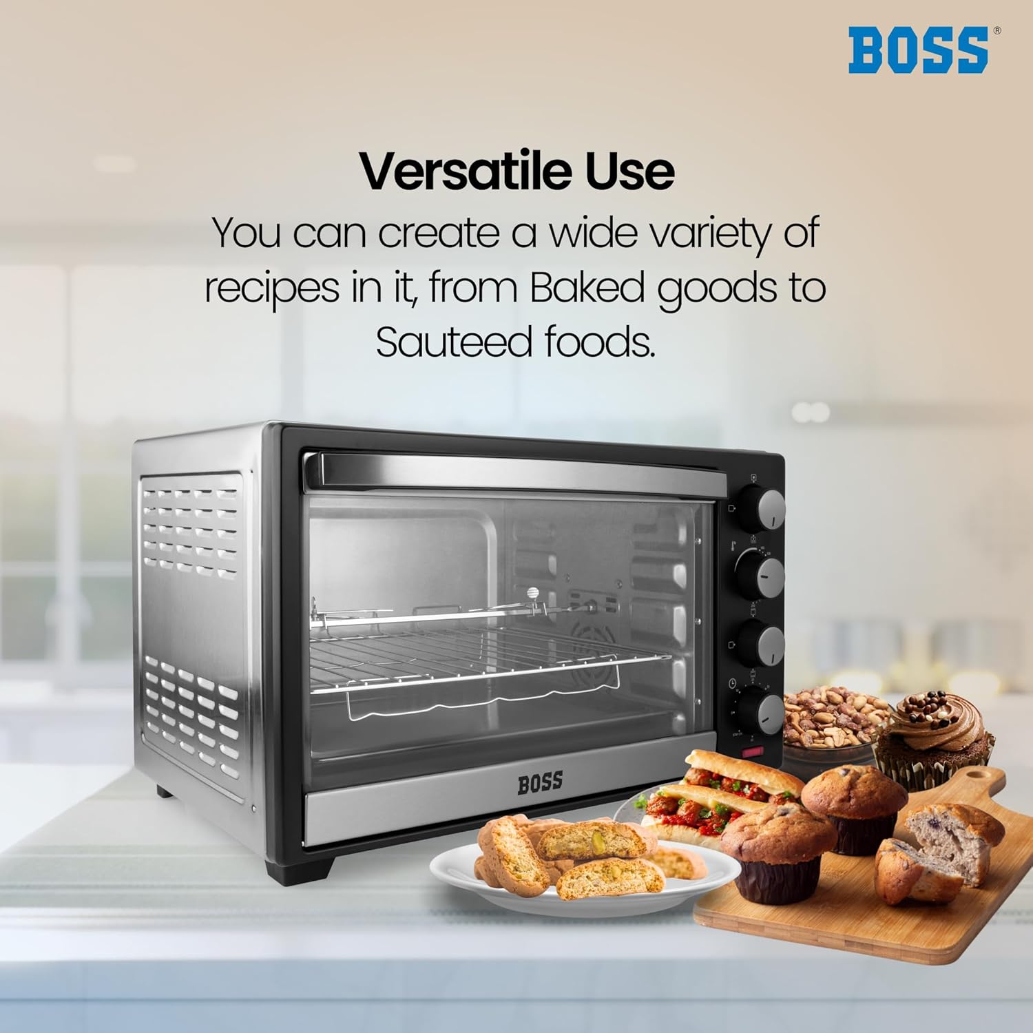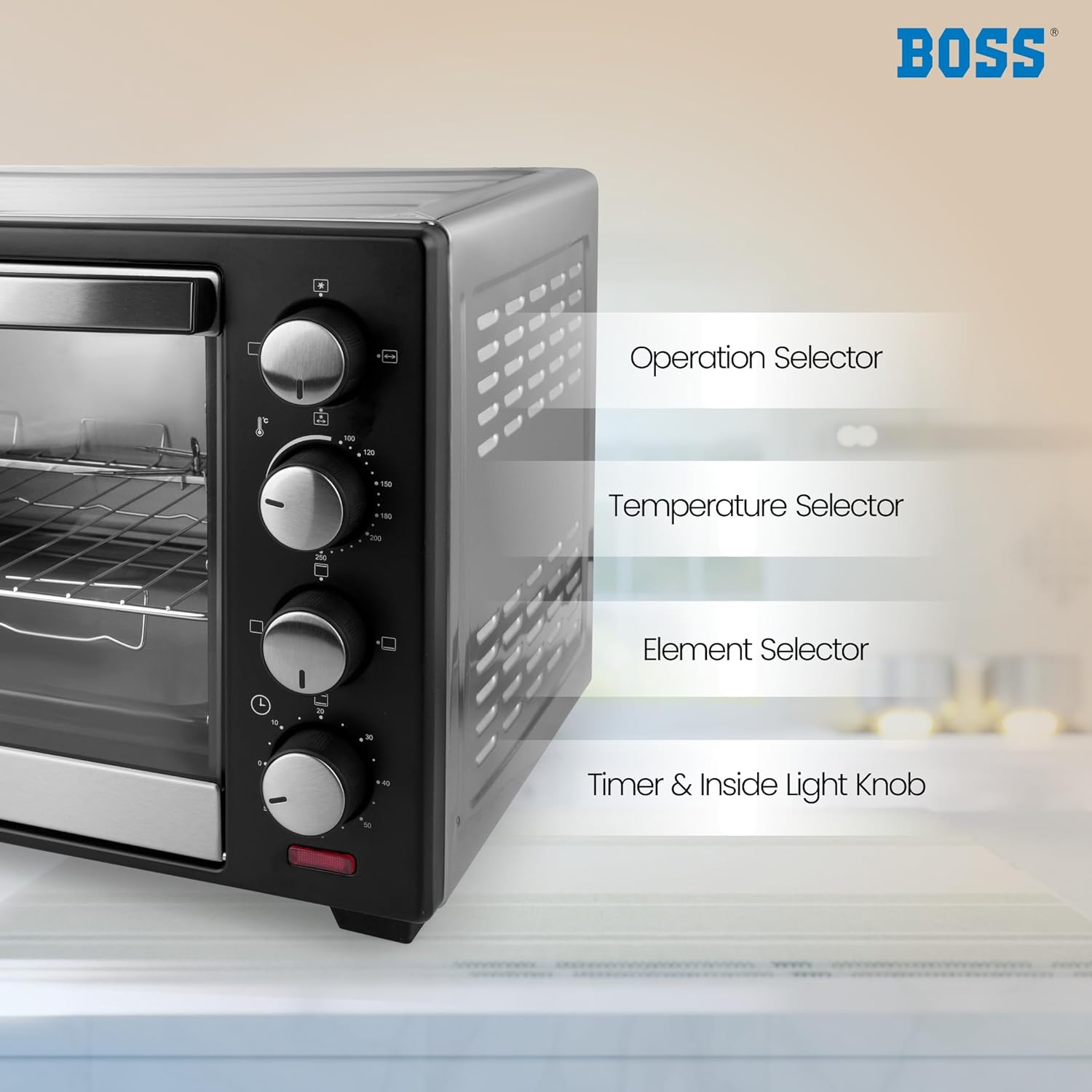 Discover a delicious and healthier way of cooking with this 25L BOSS Delish Oven Toaster Griller. Load your favourite delicacy onto the non-stick baking tray or motorized rotisserie for grilling. Be it Indian, Italian, Mexican or a dish of any other country that you have a hankering for, this OTG virtually transforms your kitchen into a world kitchen. Its 25 litres capacity allows you to experiment with just about any culinary delight. A Stay On function keeps all that you have prepared warm and fresh until it is served.