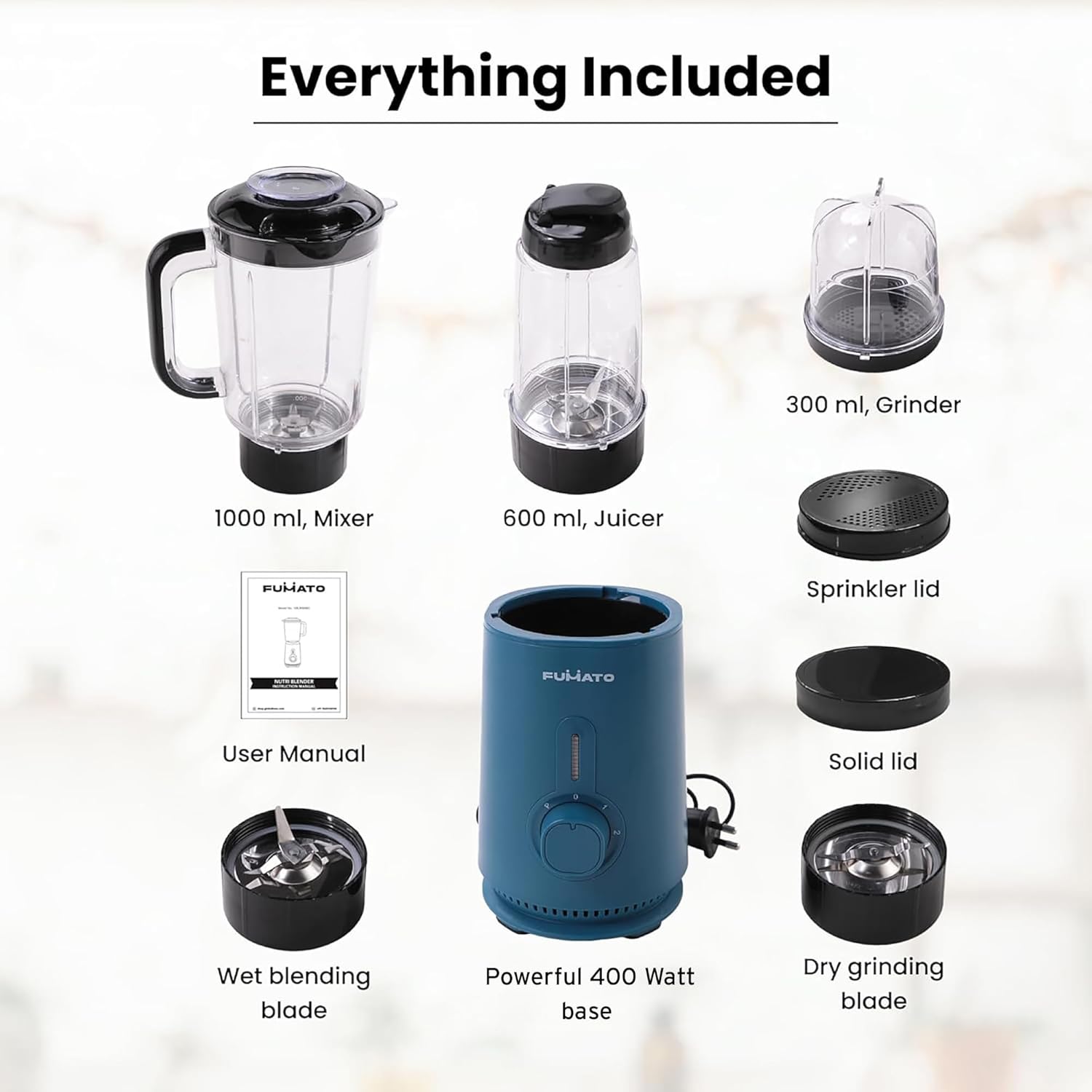 ✅ POWERFUL & ADJUSTABLE SPEED: With a 400W motor with output upto 800W and adjustable speed control, the FUMATO Mixer Grinder offers power and speed options for various functions like blending smoothies, juices, and grinding dry spices. The mixie comes with 1 body, 3 jars of different capacities (300ml, 700ml, 1250ml), and 2 knife blades, making it suitable for a wide range of blending needs.