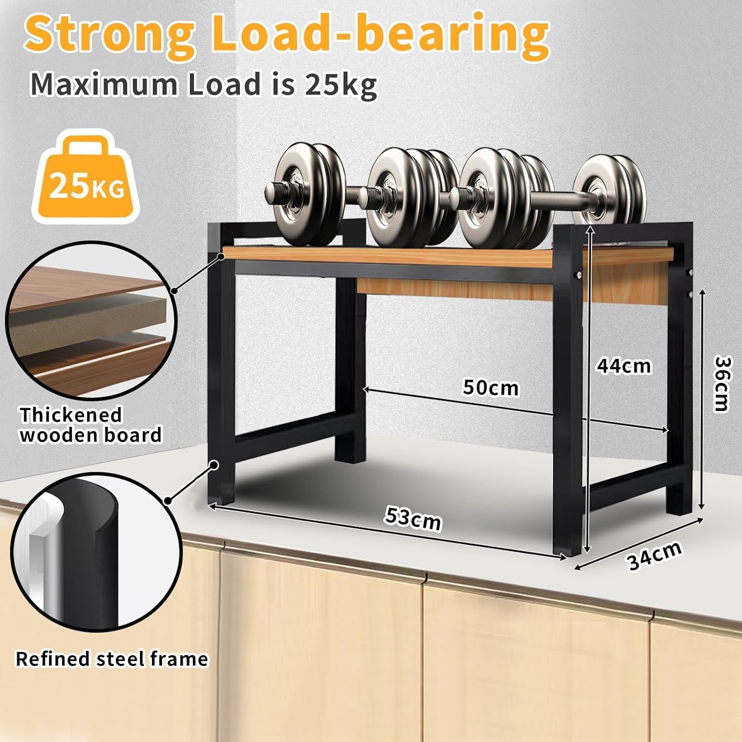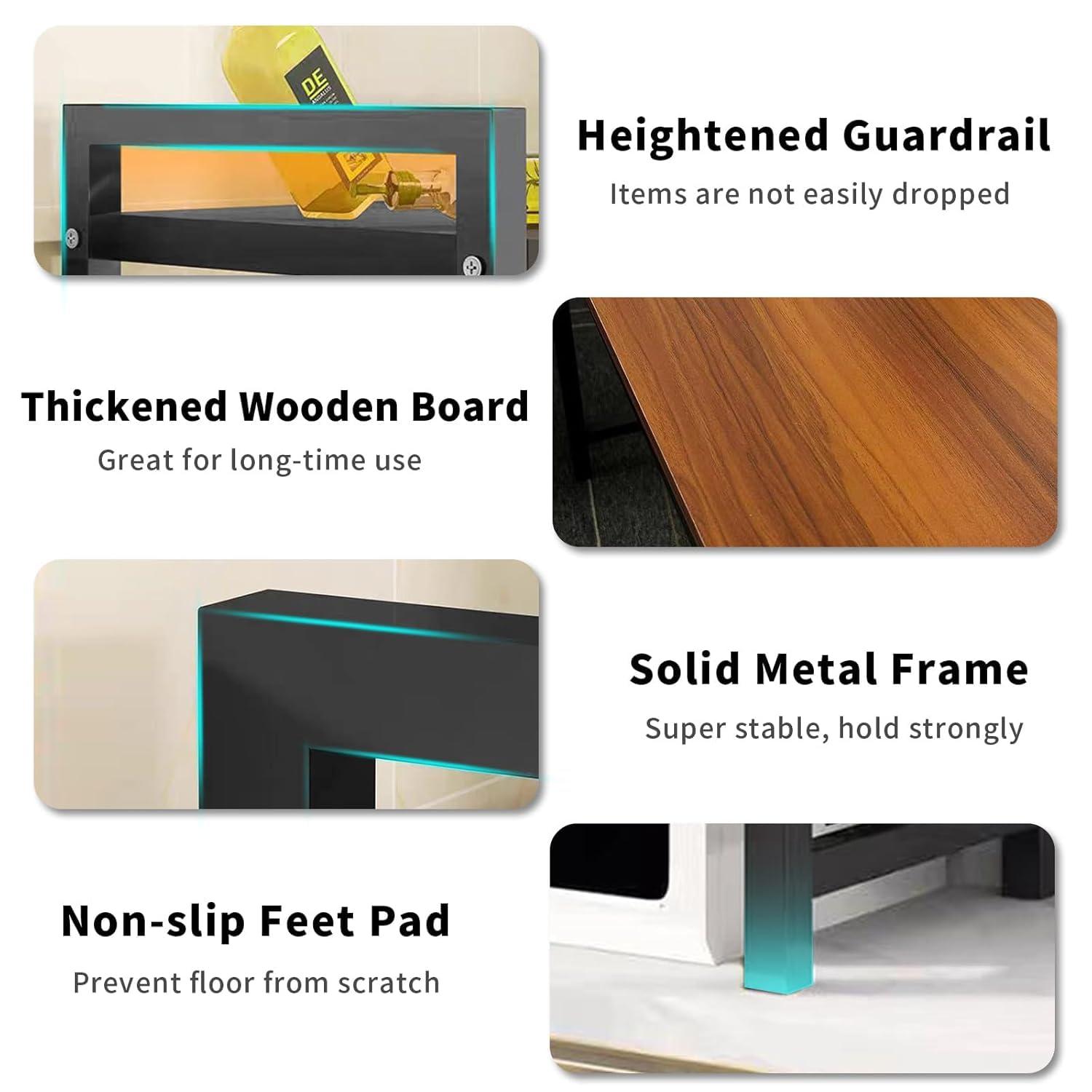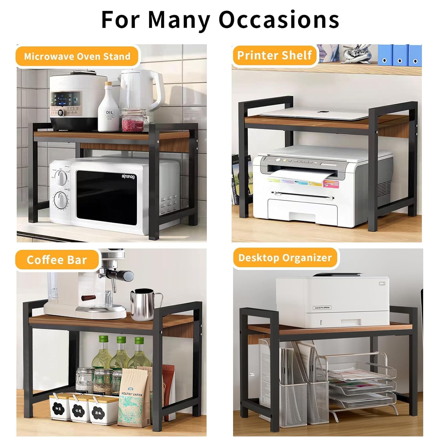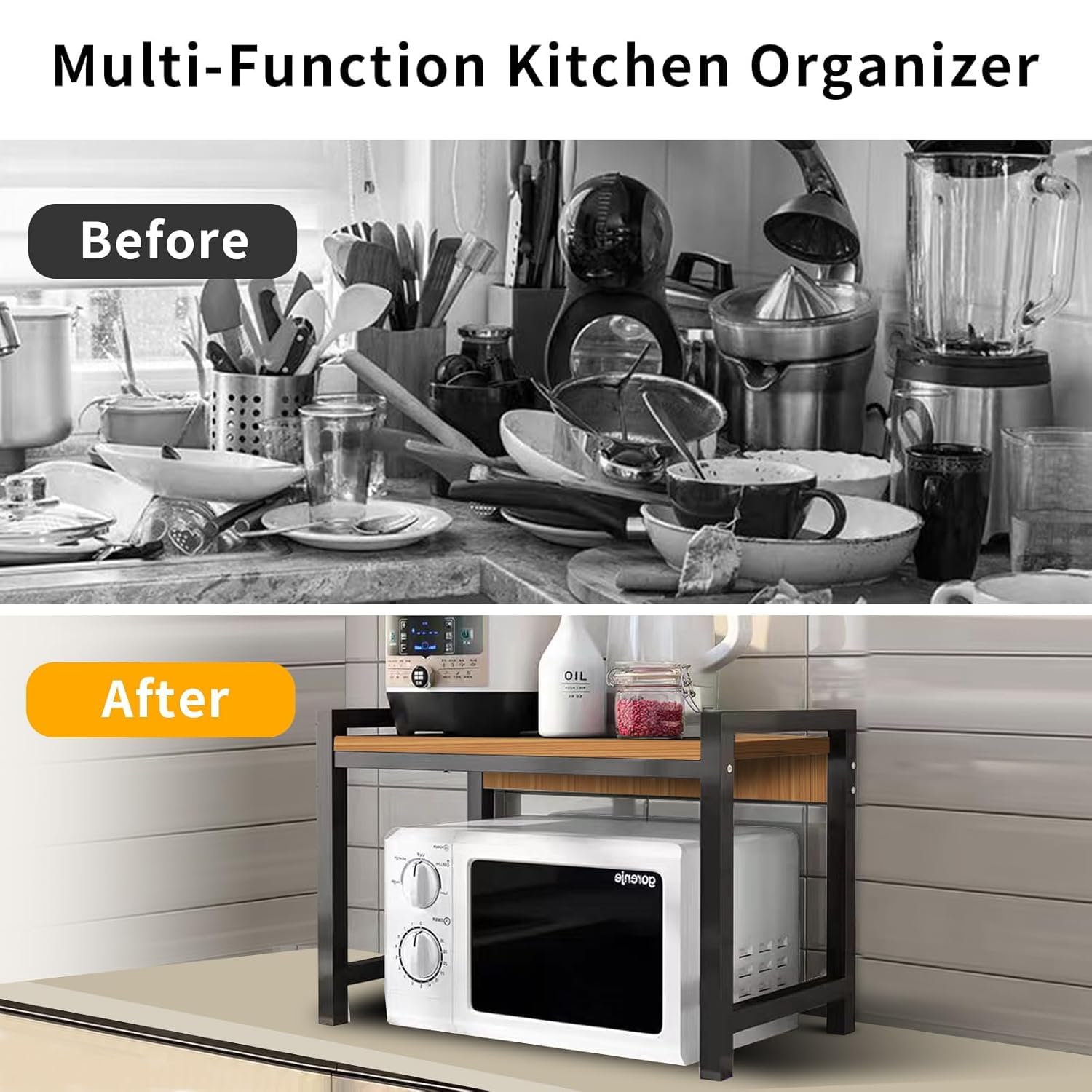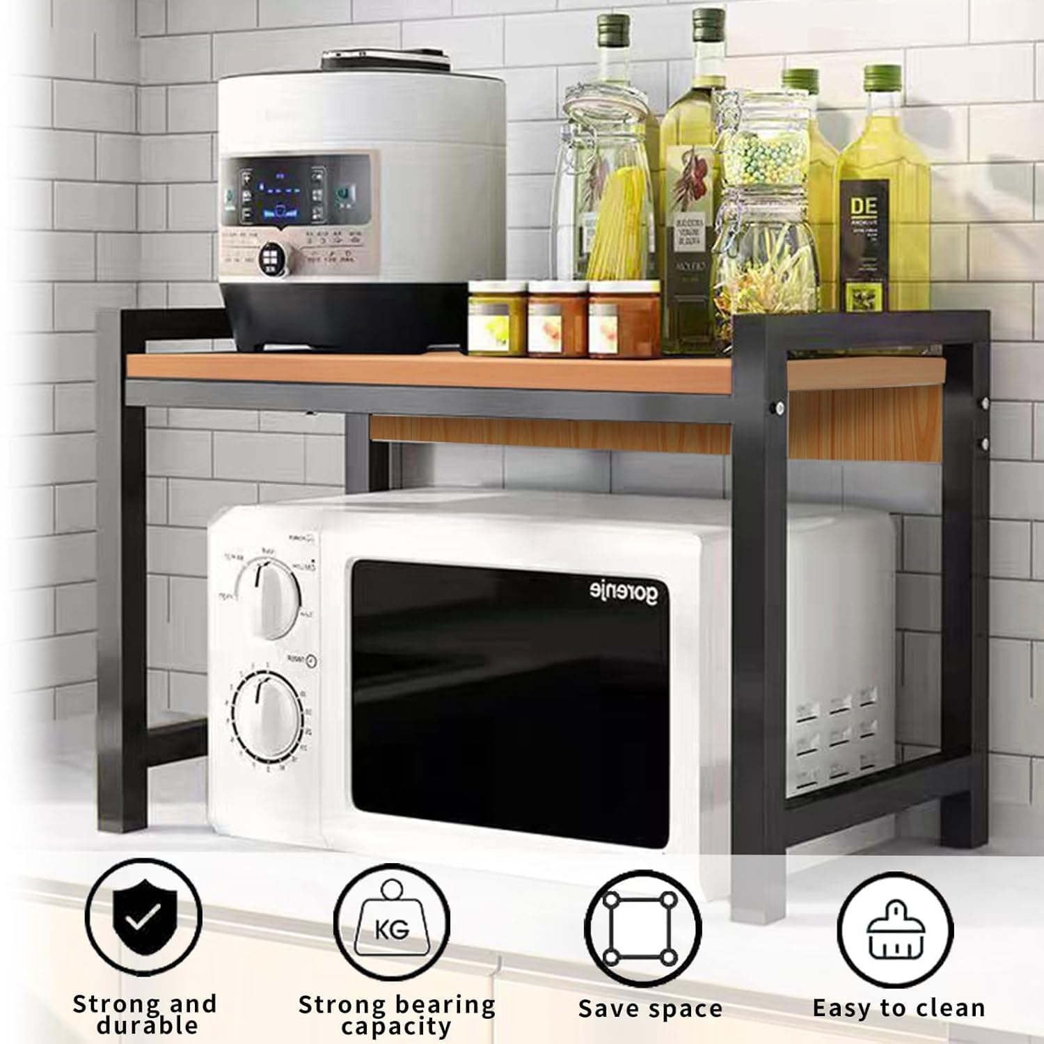 This stand can accommodate multiple brands and models of microwave ovens and toaster ovens, effectively saving kitchen space and keeping countertops tidy. Also a smart choice for organizing various kitchen utensils, with a weight capacity of 30kg and a durable design made of metal and wood. It is the ideal choice for household kitchen utensils.