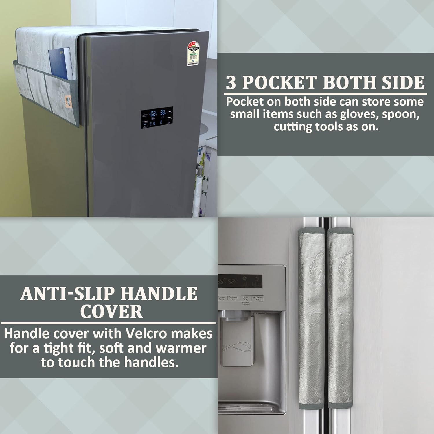Content – 3 pieces of mat, Fridge Top Cover & 2 Handle Cover, Material : Polyester & PVC, Beautiful Modern Design.