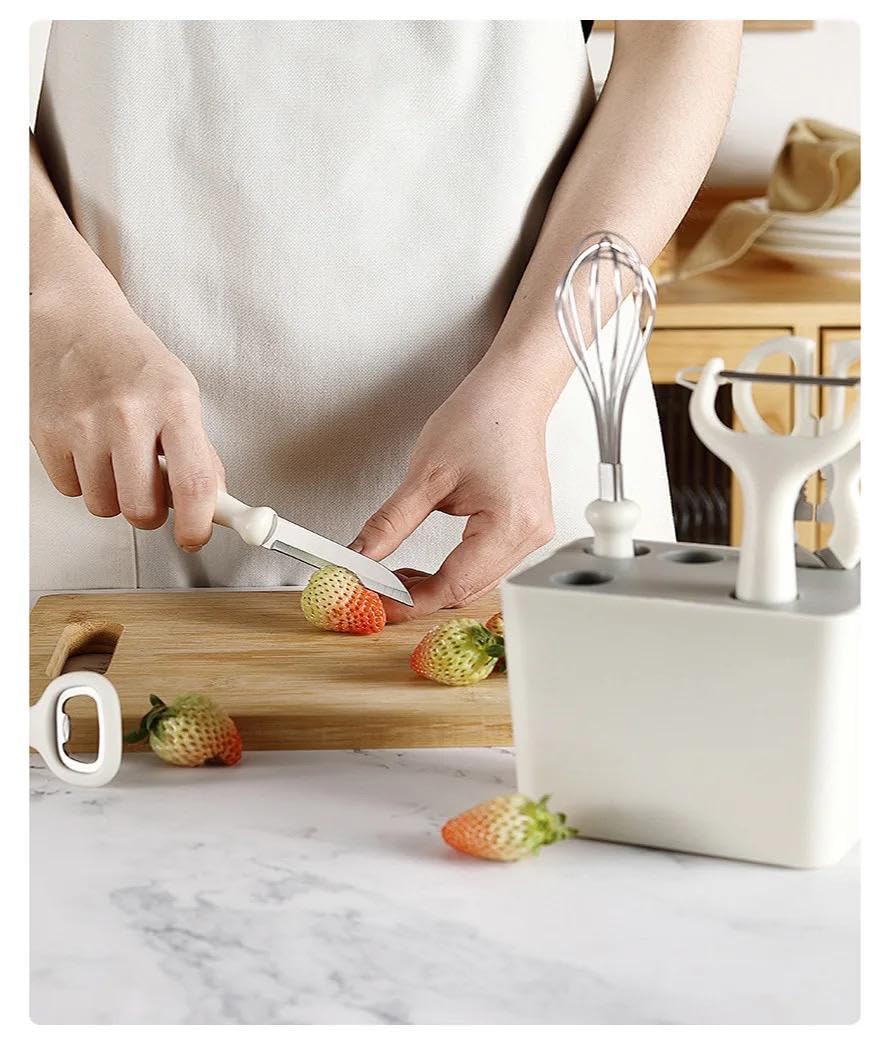Complete 6-Piece Set: Includes Kitchen Scissors, Paring Knife, Whisk, Bottle Opener, Peeler, and a convenient Utensil Holder.