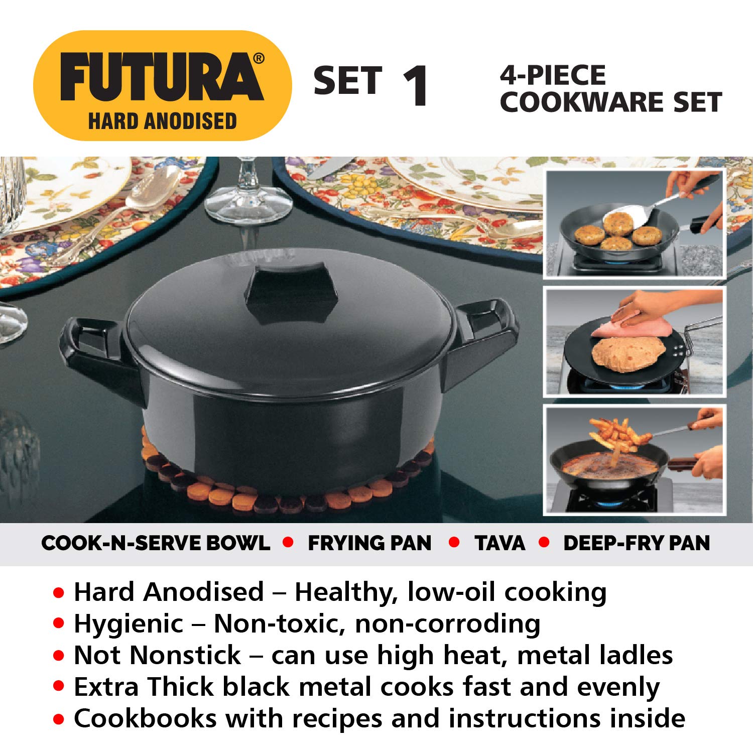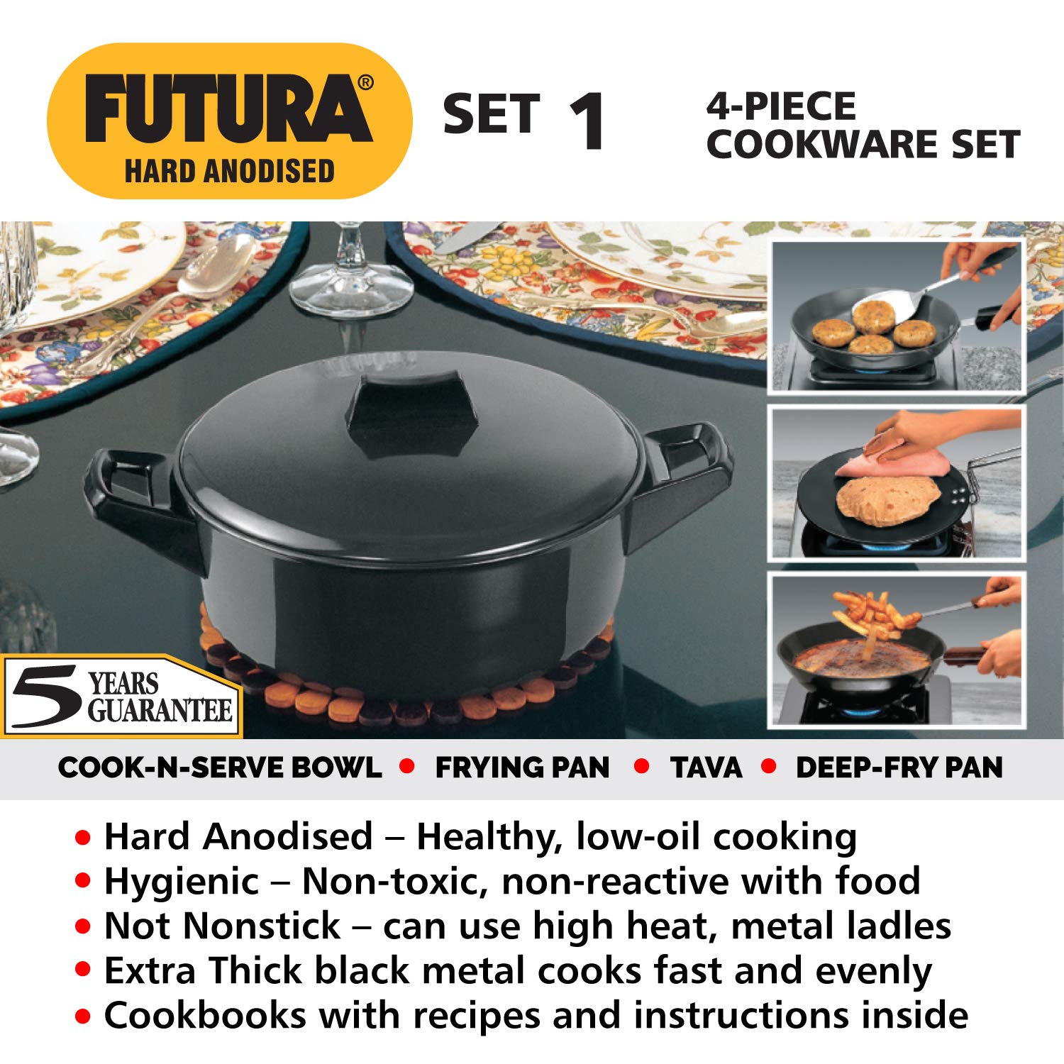 The cookware set consists Tava, Frying Pan, Deep-Fry Pan and Cook-n-Serve Bowl with lid to cater to most of your cooking needs
