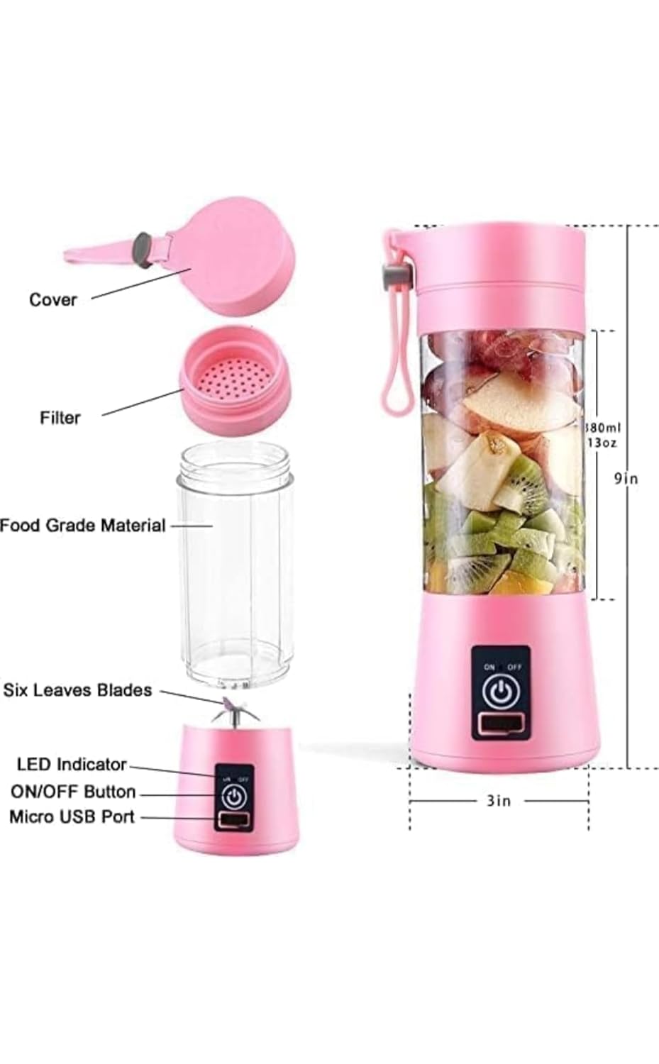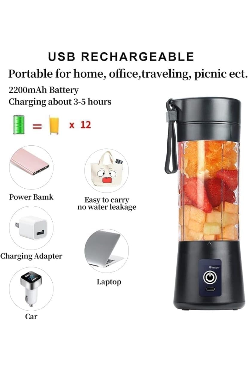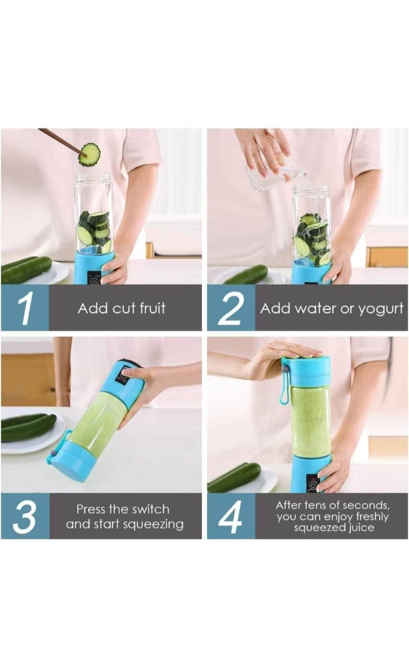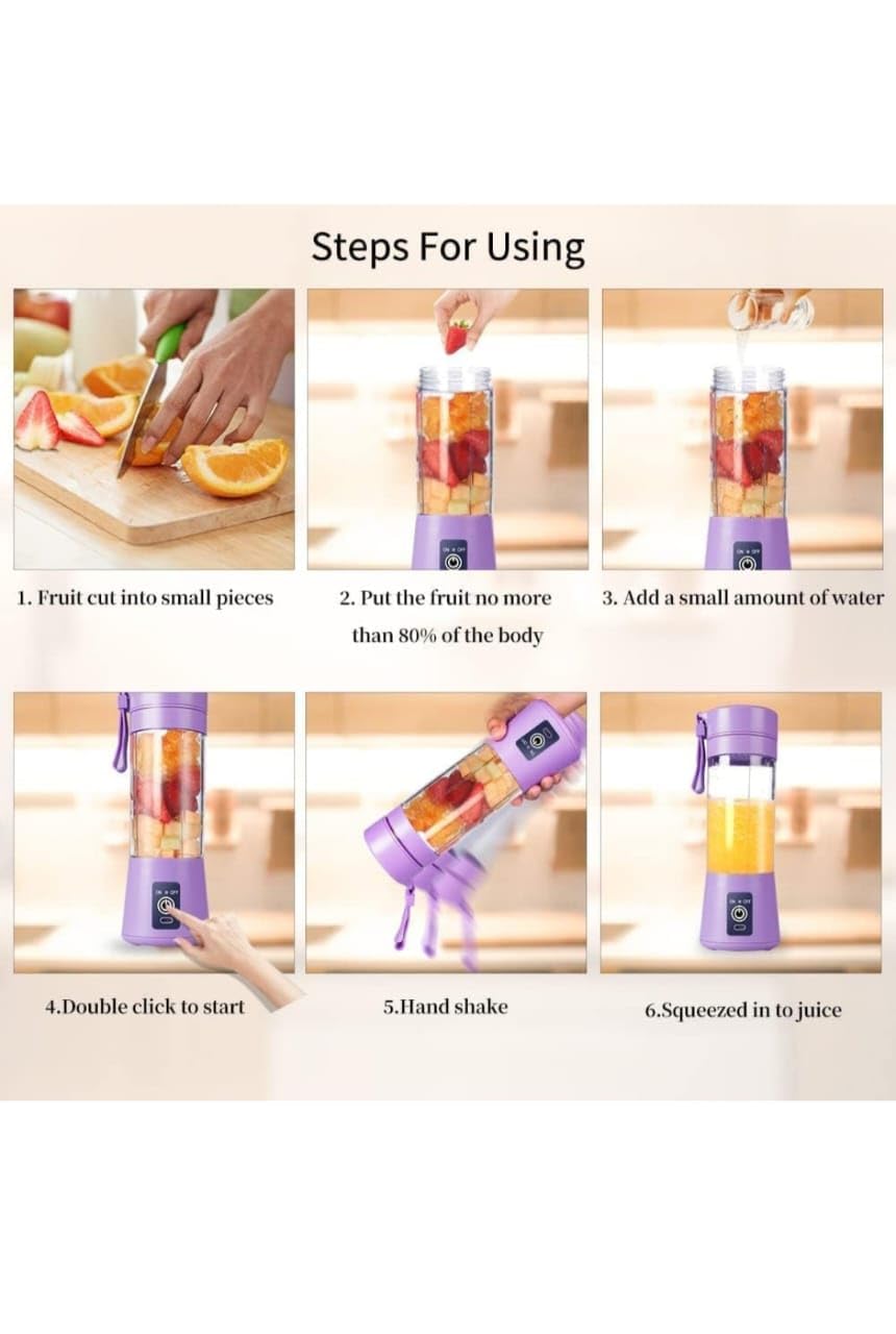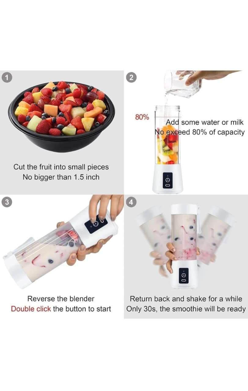 Add Ingredients: Cut fruits or vegetables into small pieces and place them into the blender bottle. Add a little water or milk if needed.Close the Cap Securely: Make sure the lid is tightly closed to prevent leakage.Double-Click to Start: Press the power button twice to activate the motor.Blend for 30–60 Seconds: Tilt and shake slightly for better blending performance.Pour and Enjoy: Use the built-in strainer to filter pulp and enjoy your smooth drink directly or pour into a glass.