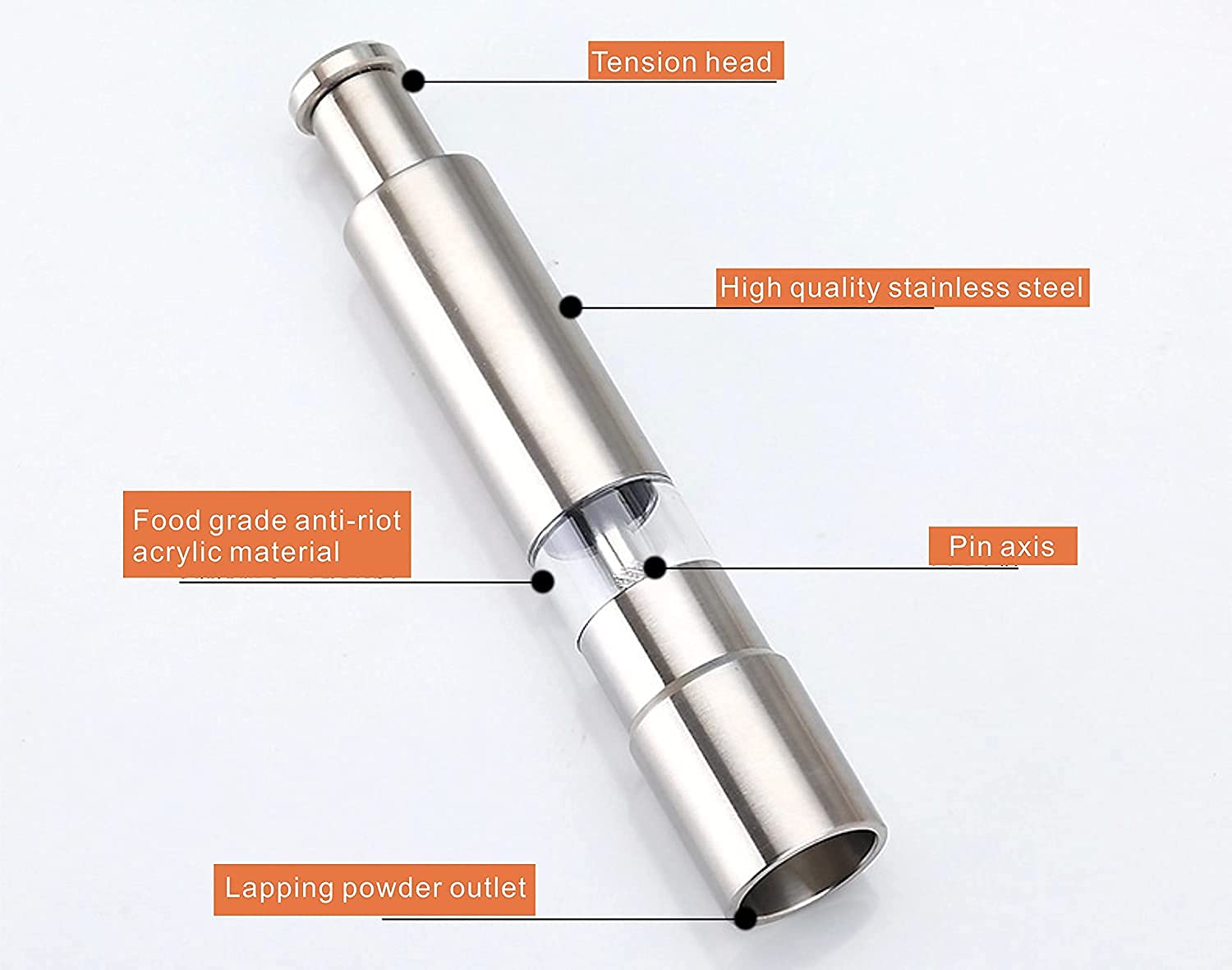This premium stainless steel pepper grinders features an easy-to-press one-click button, and our designed grinding rod ensures efficient grinding, Just press the button on the top and our grinder will do the rest for you.