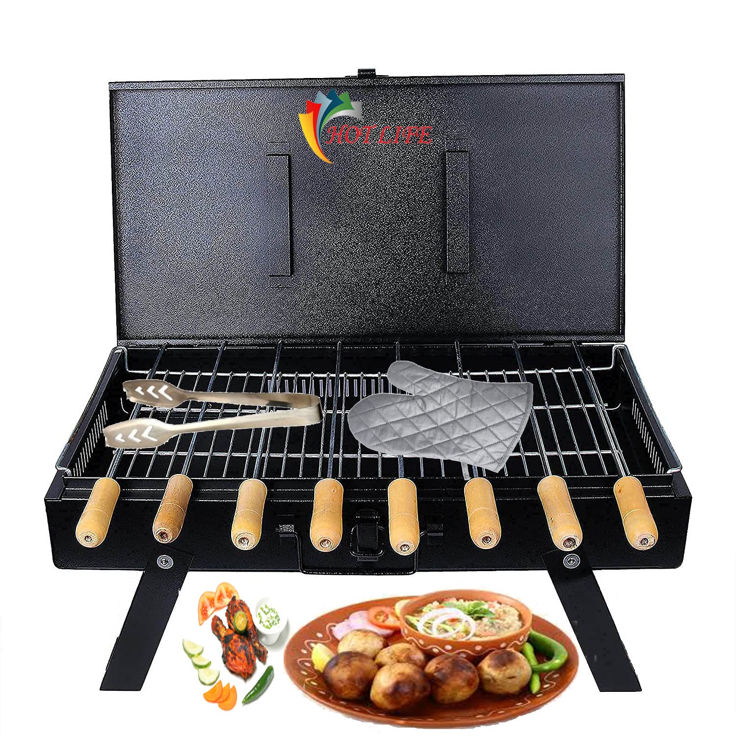 Heavy & Durable Grills. This product comes with a warming rack with grills made of metal to keep the food close enough to the heat of the coal and provide adequate cooking. Heavy & Durable rust proof body. This barbecue comes with a sturdy iron construction, which comes coated with a durable paint to ensure that you can make the most out of it. The paint may go over repeated fire contact. Helpful 8 Skewers which enables you to pierce your favourite vegetables or meat with the skewers and place them atop the barbecue station to cook them with the aroma of charcoal. You can use all skewers when entertaining your guests. Foldable Mechanism. The barbecue set requires less storage space and with fold-able feature, it can be carried and assembled wherever required. It is easy to clean the barbecue set, thus making it portable and user friendly. This barbeque is extremely easy to assemble as well as clean. Coal-based cooking with unique warming rack. Easy handling. Moreover product developed under “Make In India”BRAND HOT LIFE
