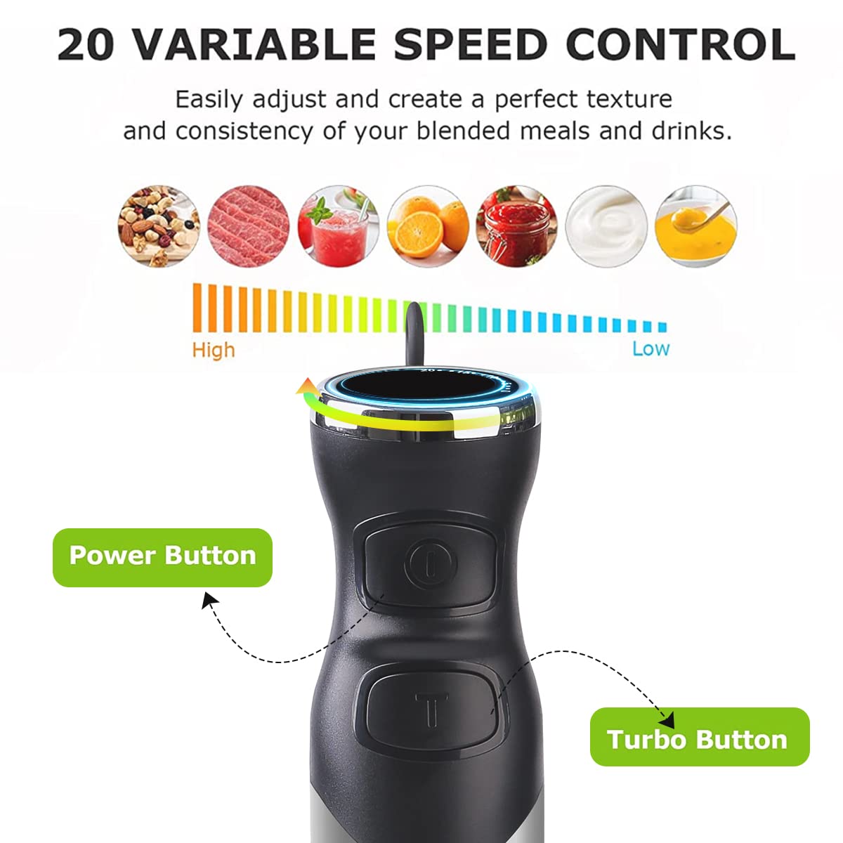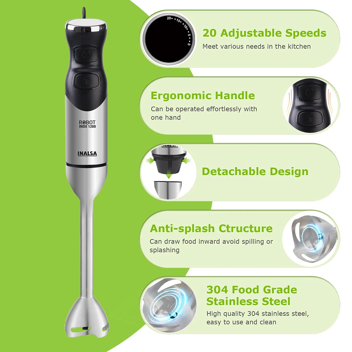 EFFECTIVE 20 SPEEDS & FUNCTIONAL TURBO BUTTON: INALSA hand blender with 20 variable speeds control, adjust the blade speed and the texture of every blend and give you maximum choice and precision to prepare foods from smooth purees to chunky homemade salsas. A separate Turbo Button gives quick burst of power to blast ice faster and blend your ingredient or refresh the blade and cup with water for fast cleaning.