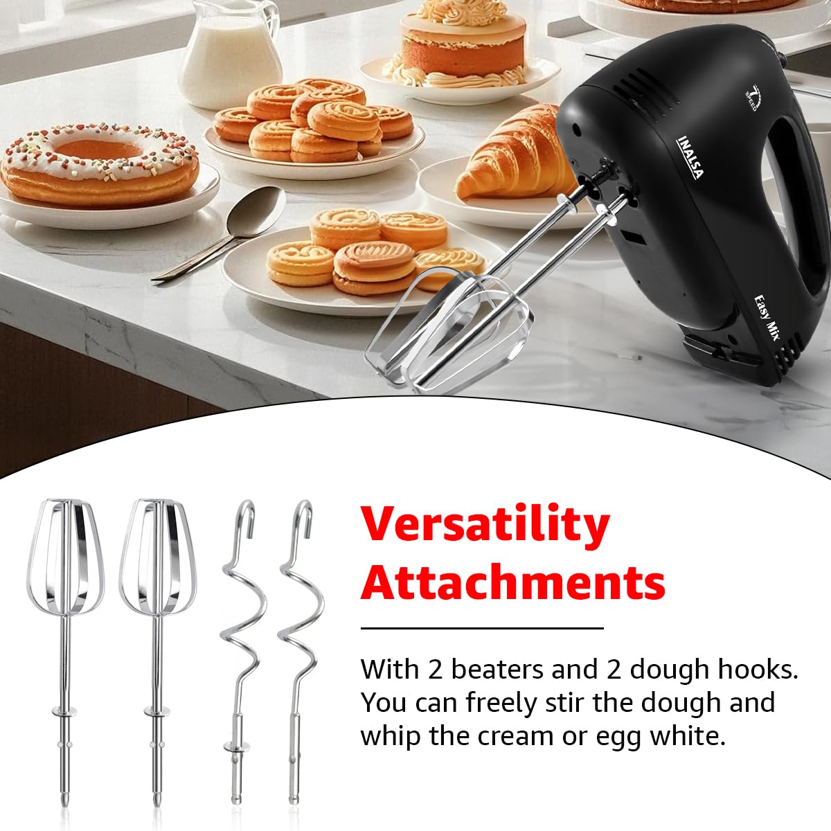 Attachments for all your cooking tasks:Beat, Mix, Whisk, Blend, Mash with Quality stainless-steel attachments.2 Detachable Beaters & Whisker/Dough Hooks that will take care of your meal preparation. Now making doughs& batters is quite an easy task