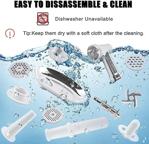 ✔️【Rverse Function】In case of jamming switch off the appliance by pressing the ON/0/R switch to”R” position. Meat will be rotating in the opposite direction, and the head will get empty. All parts of the meat grinder attachment are easy to clean. You can clean them with soap and warm water and dry them with a towel. Note: DO NOT put in the dishwasher.