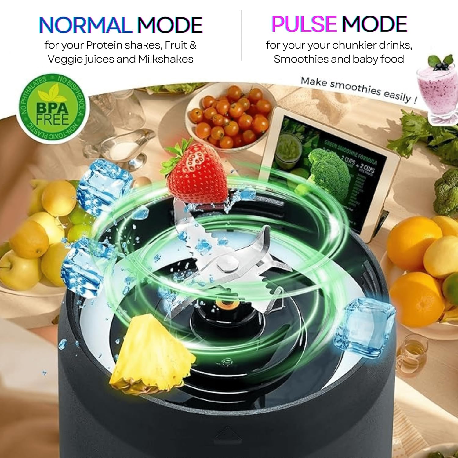 VERSATILE DUAL MODES WITH PULSE MODE: Equipped with two modes—Normal and PULSE—it functions as a mini mixer, juicer, and hand blender, ensuring the ideal consistency for fruits, vegetables, and more. This portable blender is perfect for making smoothies, juices, and purees at home, in the kitchen, or on the go.