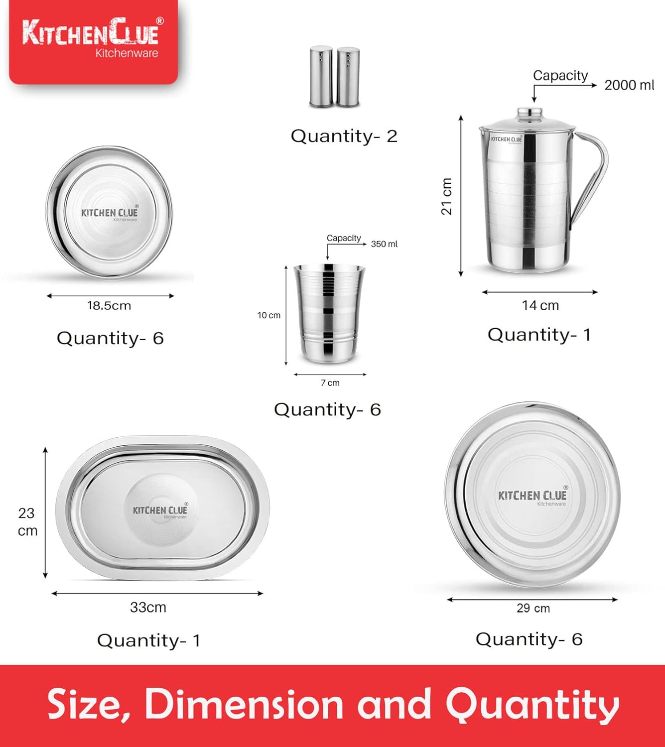 Serve a variety of delicious home-cooked delicacies for lunch and dinner using the KITCHEN CLUE Premium Grade Stainless Steel Dinnerware Set. 100% Food Grade Quality And Dishwasher Safe.______Manufactured using IS Standard Stainless Steel, this dinner set is Highly durable and long-lasting. With 51 components including a variety of plates, vatis, serving bowls, spoons and forks, Dish Bowls you can choose to serve dal, rice, curries, pickles, salads, Indian desserts, cut fruits and many more items.______Being food-safe and rust-proof, this dinner set offers a safe eating surface. This dinnerware set is scratch Resistance and chip resistant making it ideal for indoor dining and outdoor barbecues and parties. The KITCHEN CLUE Heavy Guage Stainless Steel Dinnerware Set maintains a classy and shiny appearance and can be used for ages.______This set comes in an attractive Silver Touch Finish design that gives it a neat look.______ It does not retain or impart colours, odours, stains or flavours and is suitable for serving all types of cuisines. It is ideally sized and designed to be used by the entire family including kids, teenagers and adults. ______It is easy to clean and maintain and can be put through your dishwasher for a thorough cleaning And It Is Used On Regular Basis Purpose. ______The beautiful dinner set makes it too beautiful enhance a dinner table in front of various guests as well as for the daily use. ______Made from high-quality stainless steel. Resistant to corrosion. Lifetime guarantee on manufacturing defect. ______The 51 pcs stainless steel dinner plate set. ______It is for multipurpose use for in-home, offices and restaurants. It includes the heavy plates which are required everywhere. It is very economical in range, made of food grade stainless steel. It is non-breakable, durable, sturdy, rust free and long lasting.