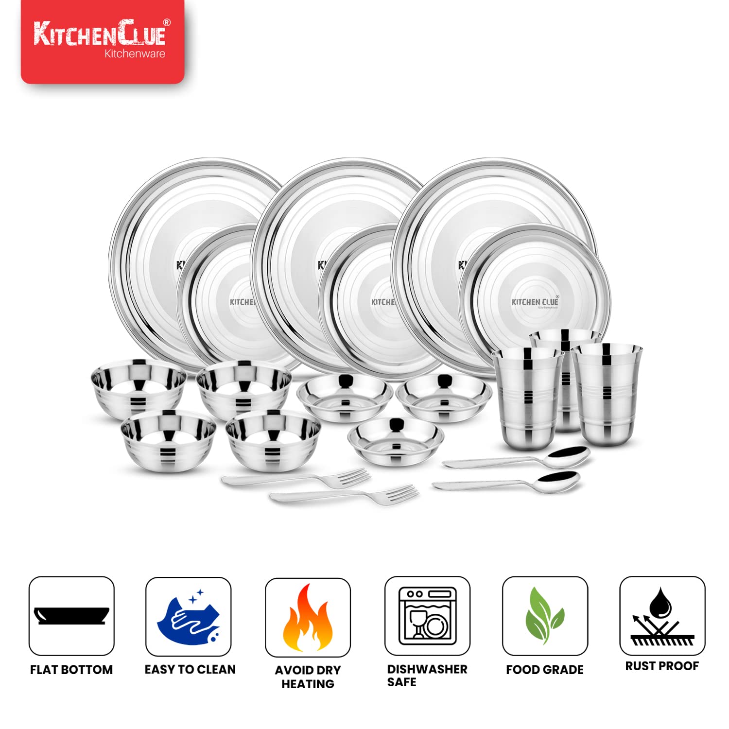 Serve a variety of delicious home-cooked delicacies for lunch and dinner using the KITCHEN CLUE High Grade Quality Stainless Steel Dinnerware Set. 100% Food Grade Quality And Dishwasher Safe.______Manufactured using IS Standard Stainless Steel, this dinner set is Highly durable and long-lasting. With 51 components including a variety of plates, vatis, serving bowls, spoons and forks, Dish Bowls you can choose to serve dal, rice, curries, pickles, salads, Indian desserts, cut fruits and many more items.______Being food-safe and rust-proof, this dinner set offers a safe eating surface. This dinnerware set is scratch Resistance and chip resistant making it ideal for indoor dining and outdoor barbecues and parties. The KITCHEN CLUE Stainless Steel Dinnerware Set maintains a classy and shiny appearance and can be used for ages.______This set comes in an attractive Silver Touch Finish design that gives it a neat look.______ It does not retain or impart colours, odours, stains or flavours and is suitable for serving all types of cuisines. It is ideally sized and designed to be used by the entire family including kids, teenagers and adults. ______It is easy to clean and maintain and can be put through your dishwasher for a thorough cleaning And It Is Used On Regular Basis Purpose. ______The beautiful dinner set makes it too beautiful enhance a dinner table in front of various guests as well as for the daily use. ______Made from high-quality stainless steel. Resistant to corrosion. Lifetime guarantee on manufacturing defect. ______The 51 pcs stainless steel dinner plate set. ______It is for multipurpose use for in-home, offices and restaurants. It includes the heavy plates which are required everywhere. It is very economical in range, made of food grade stainless steel. It is non-breakable, durable, sturdy, rust free and long lasting.