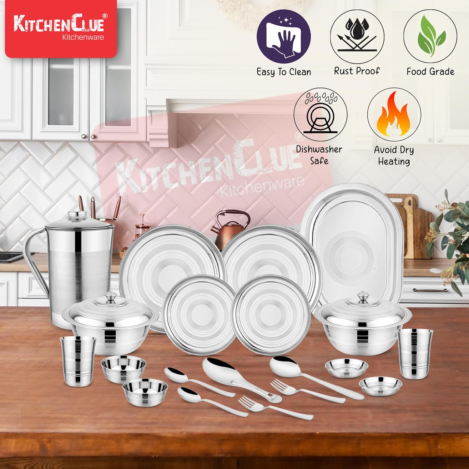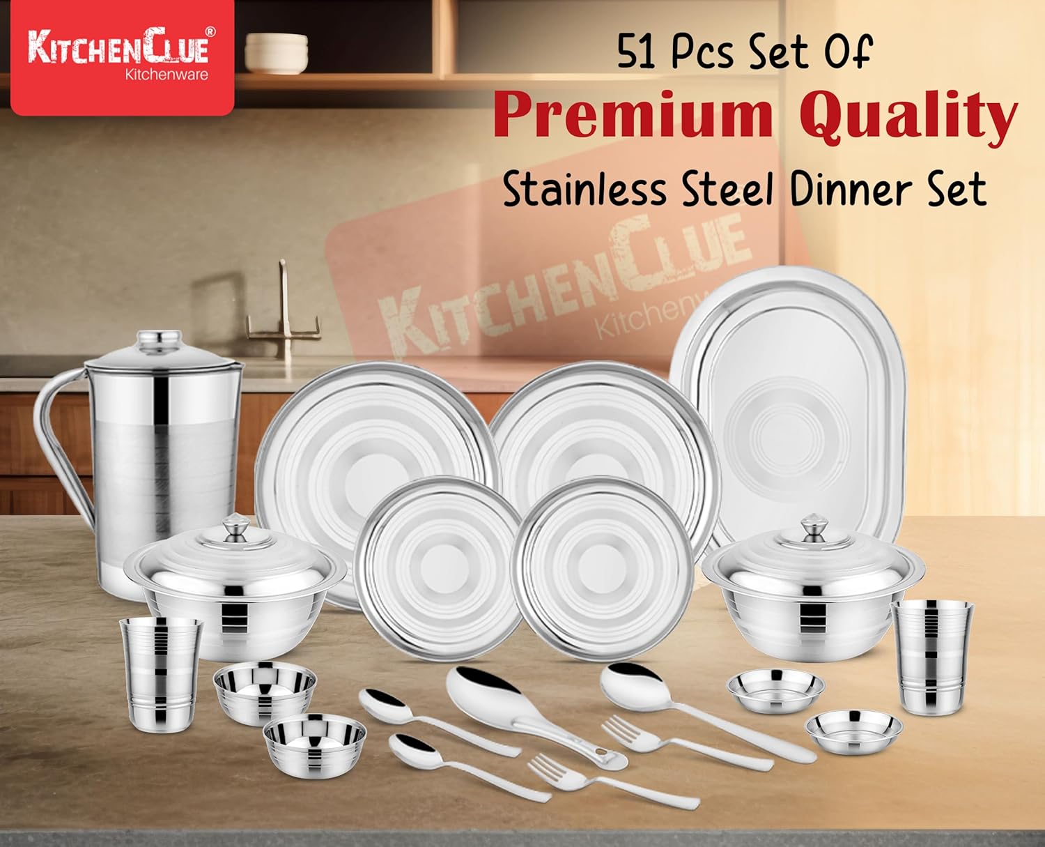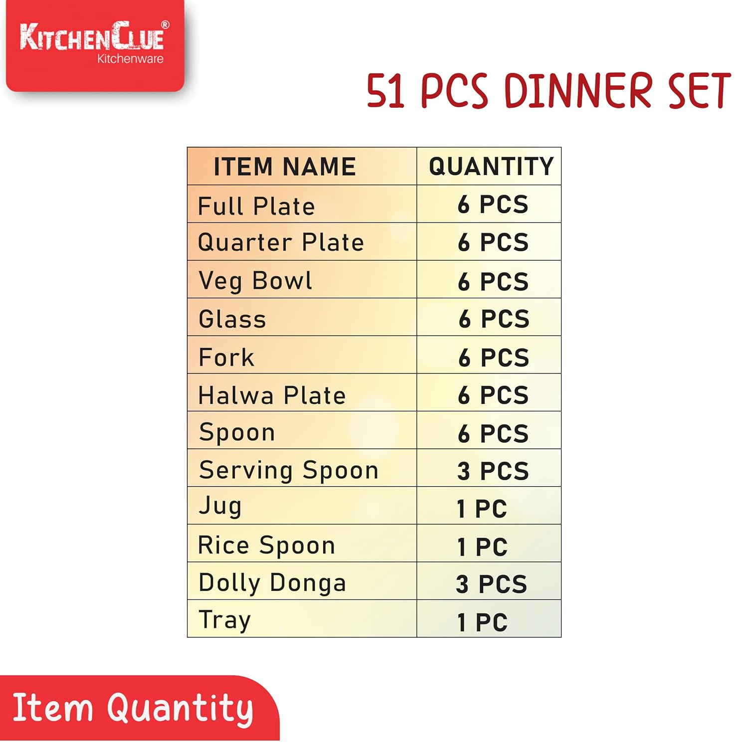 Package Contents: 51 Pieces Steel Dinner Set – 6 Full Plate, 6 Quarter Plate, 6 Glass,6 Dish Bowl, 6 Halva Plate, 3 Serving Bowl, 3 Serving Spoon,1 Jug,1 Rice Spoon,1 Serving Tray, 6 Spoon, 6 Fork