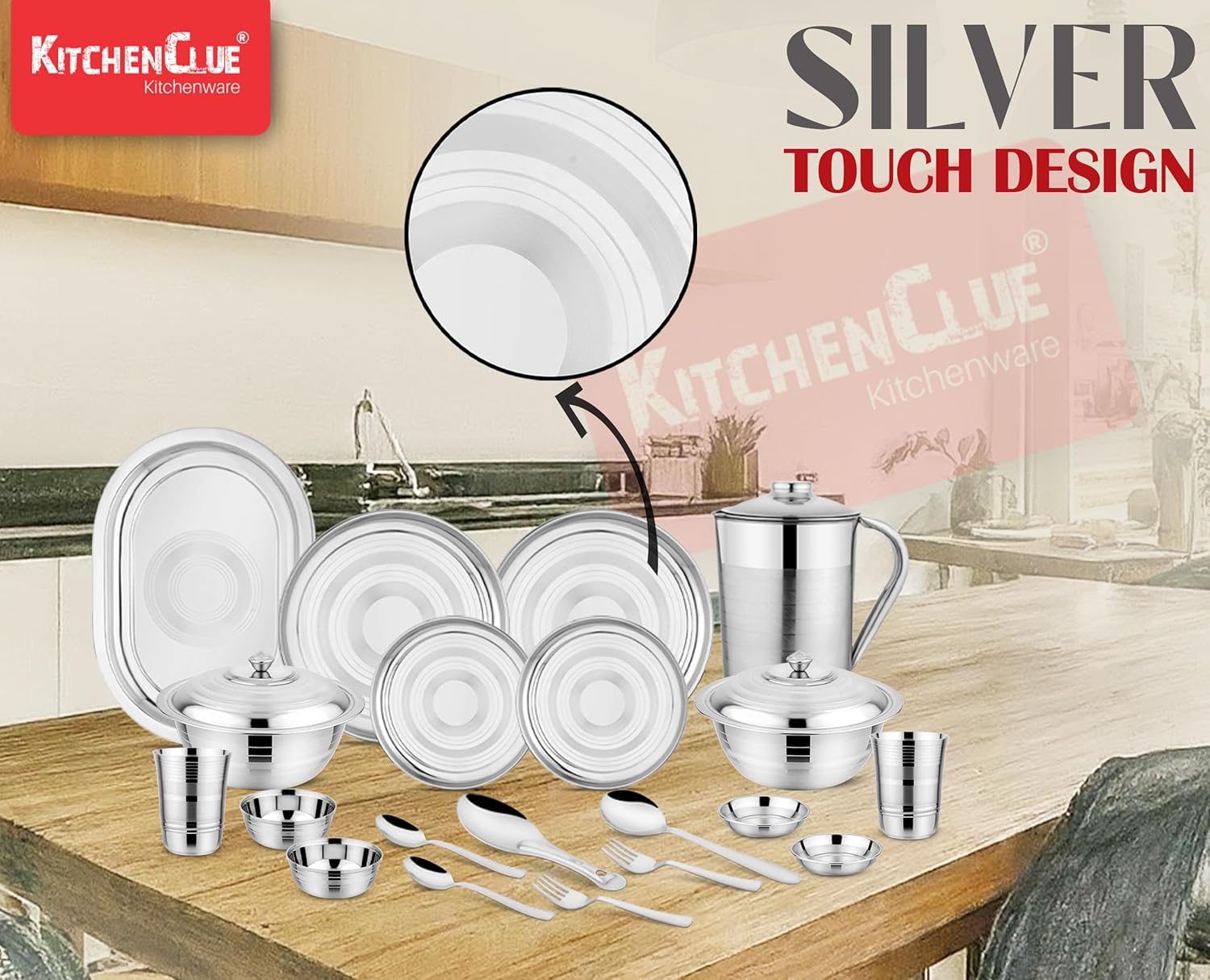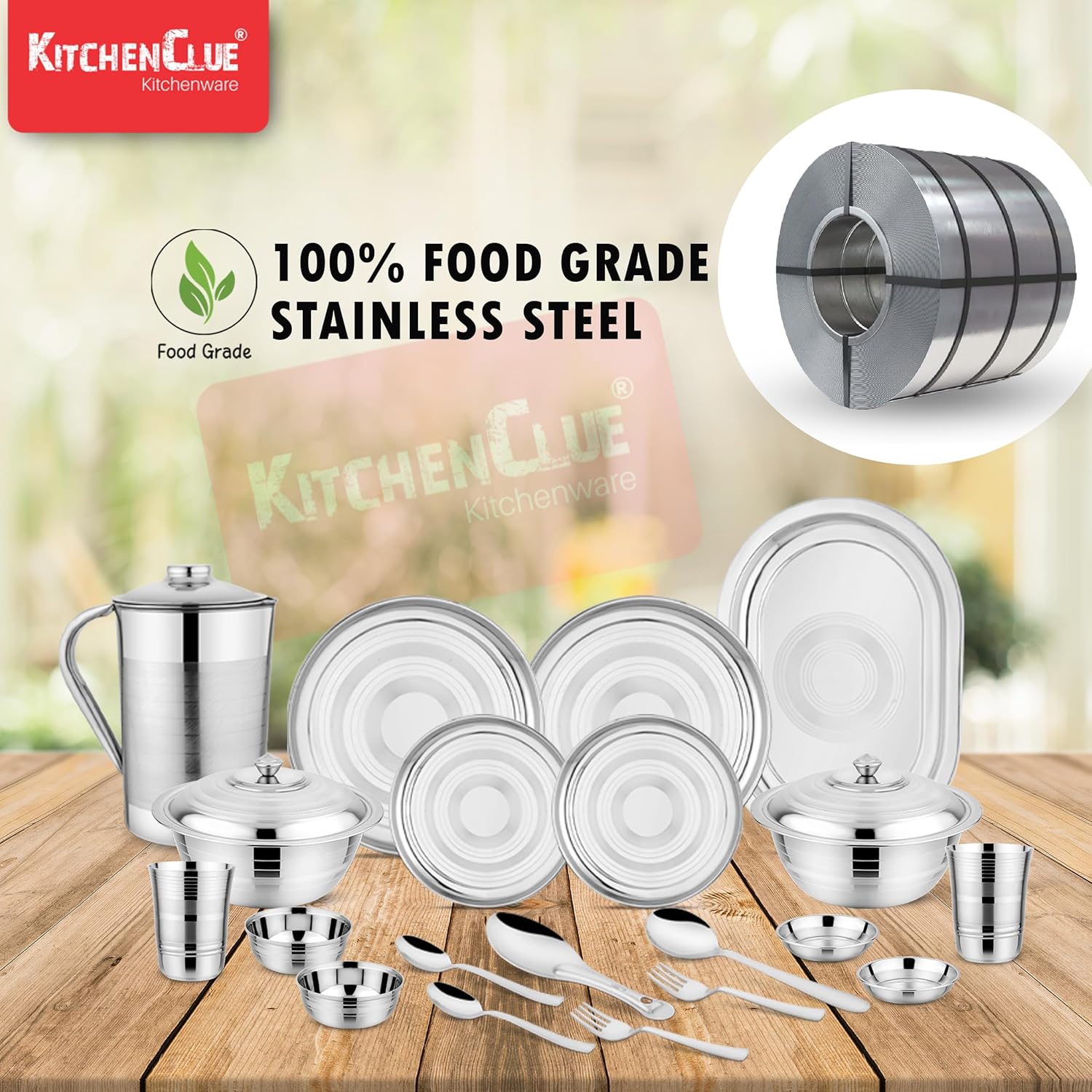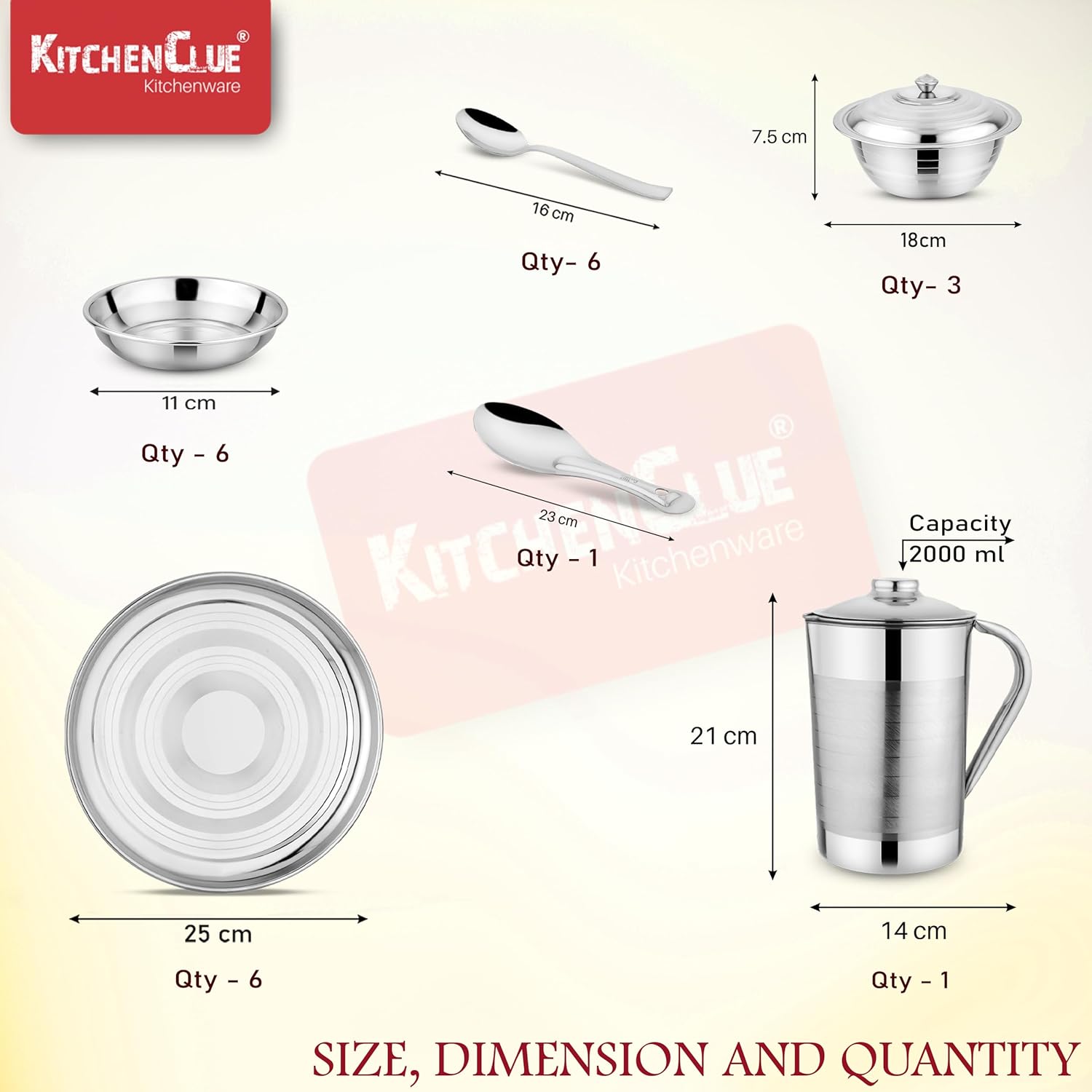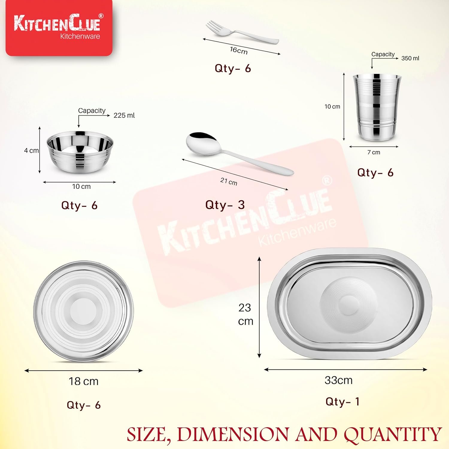 Dimensions & Size : (Serving Bowls – 17cm X 7.5cm, Weight 150 Gm) ; (Rice Plate – 33cm X 23cm, Weight 230 Gm) ; (Steel Jug – 14cm X 21cm) ; (Serving Spoon – 21cm, Weight 45 Gm) ; (Spoon – 16cm Weight 30 Gm) ; (Fork – 16cm, Weight 26 Gm) ; (Rice Spoon – 23cm, Weight 80 Gm)
