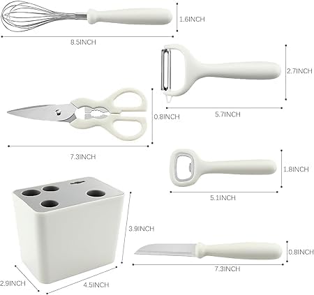 T kitchen gadget set includes: blades Peelers, 1 Fruits Knife, 1 Vegetable Scissors, 1 egg beater,1 Peeler,1 Bottle Opener and 1 Standing Storage Base.