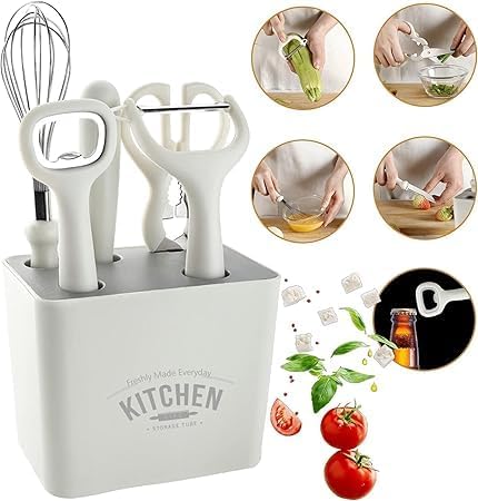 Good kitchen helper:- The exquisite kitchen tool set is equipped with multi-functional scissors, melon and fruit planer, fruit cutter, can opener, egg beater and storage seat. The perfect processing of food is a good helper in the kitchen.