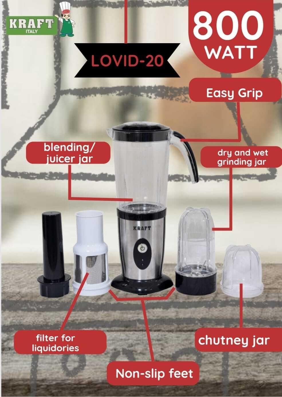 Elevate your culinary experience with the Kraft Italy 800 Watt LOVID-20 Mixer Grinder Juicer, a versatile and powerful appliance designed to meet all your blending, grinding, and juicing needs in the kitchen. Whether you’re whipping up delicious smoothies, grinding spices, or extracting fresh juices, this Mixer Grinder Juicer is your perfect companion for creating culinary masterpieces.Transform your home and kitchen into a culinary haven with the Kraft Italy 800 Watt Mixer Grinder Juicer. Designed for versatility, efficiency, and convenience, this appliance is your perfect companion for blending, grinding, and juicing a variety of ingredients with ease.