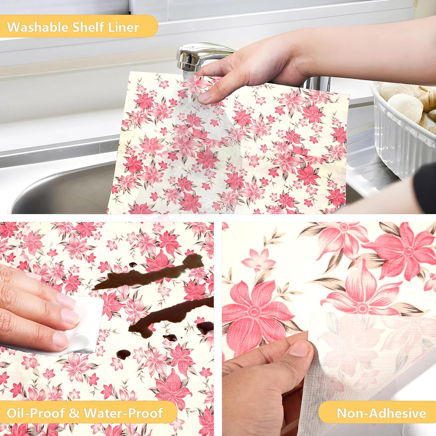Waterproof and Easy to Clean—The kitchen cabinet liners are waterproof which keep your cabinet, drawer, wardrobe,refrigerator from slimy, greasy. The non-adhesive shelf liners can be easily removed from your cabinets and cleaned with mild soap and a damp cloth or sponge, so you can keep them looking clean day after day.