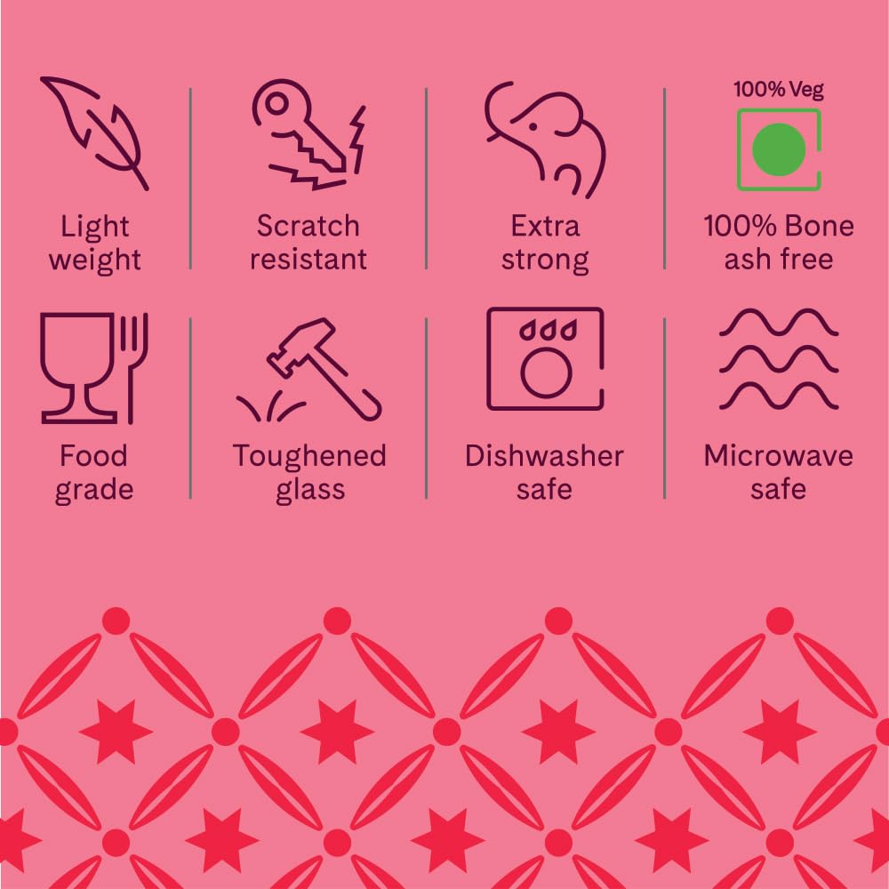 BONE-ASH FREE, 100% VEGETARIAN DINNER SET: Our entire dinner sets range are thoughtfully crafted to be completely free of any animal-derived components. Unlike traditional dinner sets, our products do not contain any bone-ash, making them the perfect choice for strict vegetarians. Enjoy your meals with peace of mind, knowing that our dinner set is truly vegetarian-friendly.