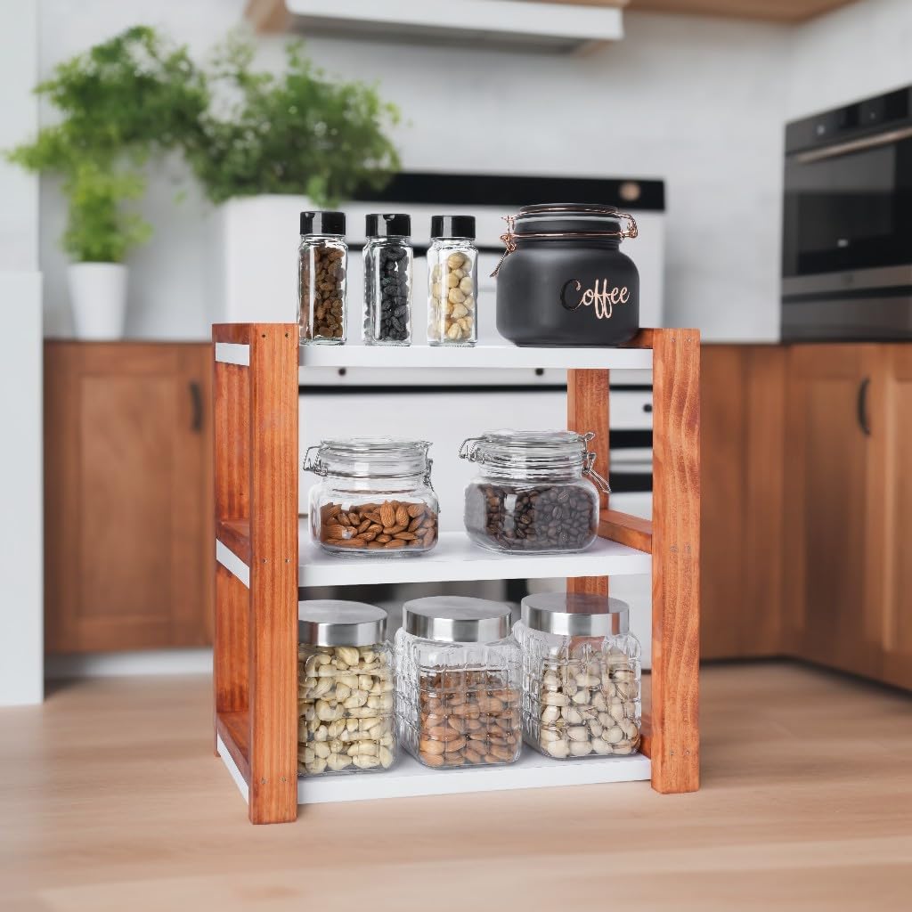 SIZE – This counter-shelf organizer measures 40 cm in Length, 40 cm in Height, a Top Shelf Width of 19 cm, and a Bottom Shelf. Space between shelves – 20 cm.