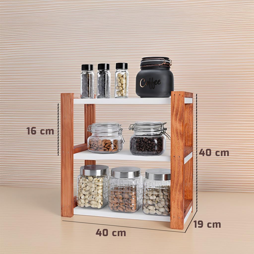 SIZE – This counter-shelf organizer measures 40 cm in Length, 40 cm in Height, a Top Shelf Width of 19 cm, and a Bottom Shelf. Space between shelves – 20 cm.