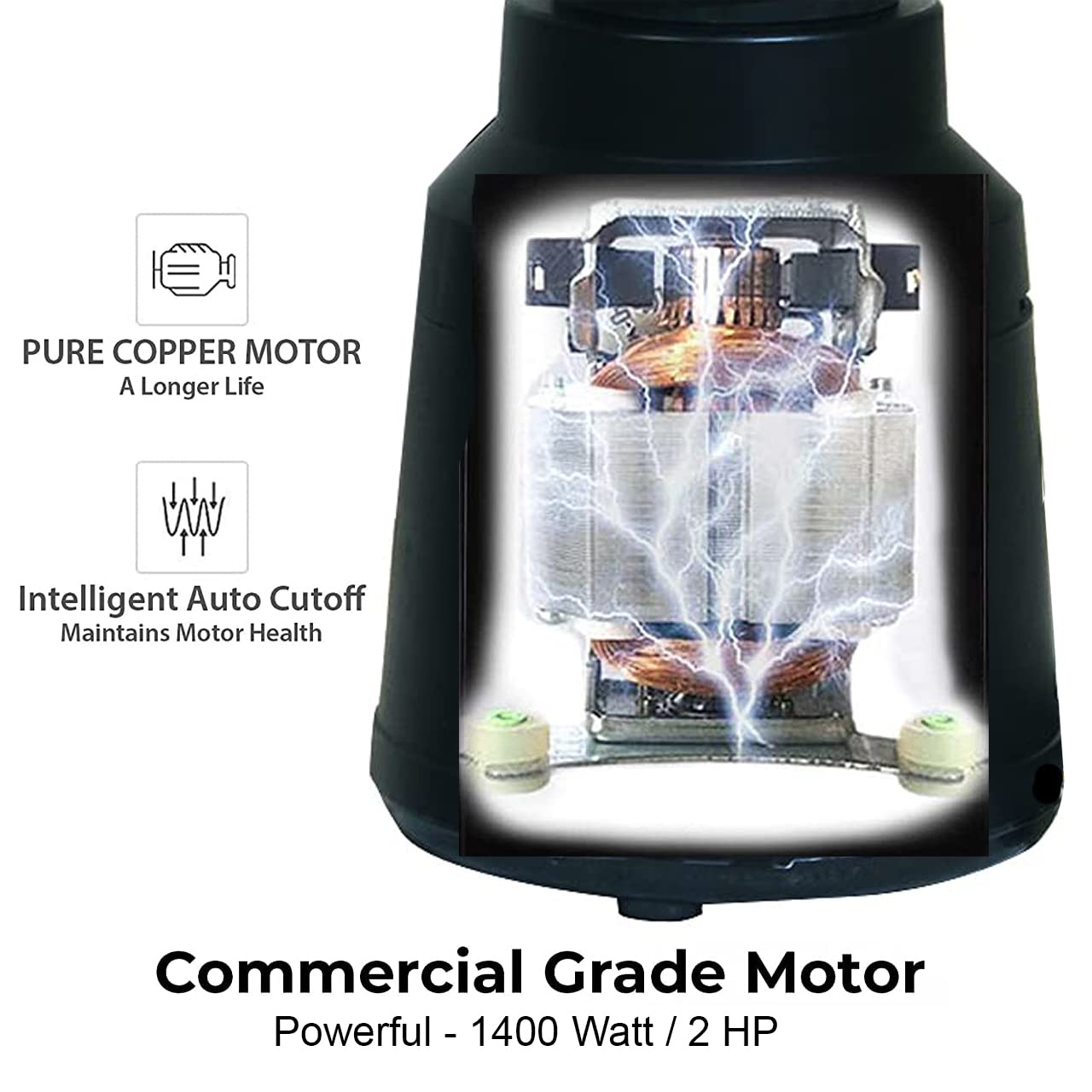 The Libra heavy duty mixer grinder’s 1400w 2 HP commercial-grade motor is dual coated with copper wire to handle heavy loads. Grind coconut, ginger, turmeric, dry masala, or any hard ingredients with ease.