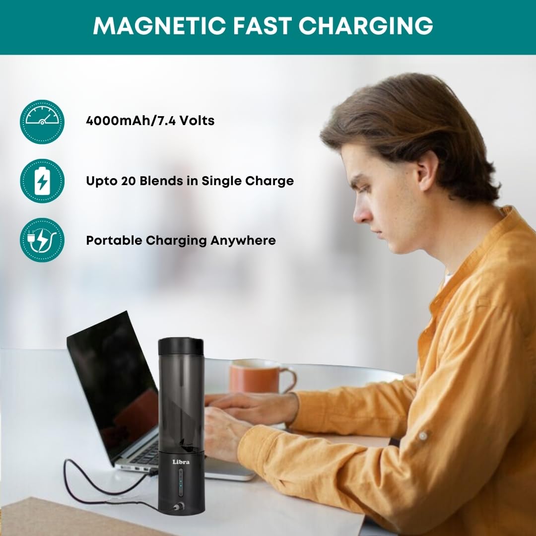 Effortless Blending with Precision and Safety: Libra wireless portable blender is powered by a high-performance 200W motor and precision stainless steel blades, delivering smooth blends for protein shakes, smoothies, baby food, and soft ingredients. This high-speed rechargeable Blender reaches 20,000 RPM for smooth blending in just 40 seconds. The 450 ml BPA-free, leak-proof jar ensures health and safety, while its premium components guarantee durability over time