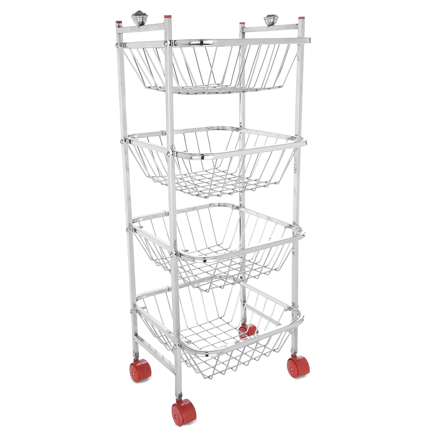 LiMETRO stainless steel Kitchen Rack Basket Trolly is ideal to keep Fruits and Vegetables, This can be used as Kitchen Trolly, this kitchen Trolly is made up with high quality stainless steel, Can be used for storage of Fruits, Onion, Garlic and vegetables in kitchen. It has long lasting quality.4 Small Shelves Where You Need Them Most Rolling storage carts are perfect solutions for small spaces. The fit between things, beside things, next to the wall, between the washer and dryer, next to the toilet, and more. The idea is simple: 4 small shelves where you need them most. Pull it out when you need it, tuck it away when you don’t. Smart Storage Shelves hook onto side frames for easy assembly. 4 baskets are perfect for holding small-mid-sized items, and keeping them handy. Practical Help Wheels means this narrow storage rack slides in and out of narrow spaces. Look for spaces at least 12 inches wide for a comfortable fit. Unexpected Storage Sewing Room Organizers Perfect in and out storage. Ideal for yarn and other larger crafting goodies. Bathroom Organizers Styling tools, spare paper, reading material, bath supplies, towels and more. Kitchen and Pantry Organizers Perfect for that small space in a pantry or beside an appliance. Rolling spice rack