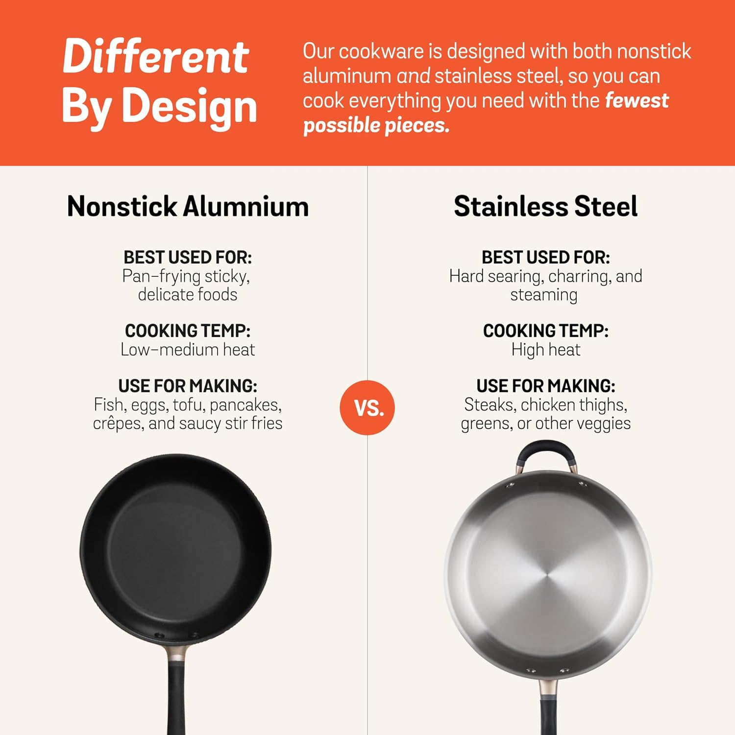 YES, YOU CAN HAVE IT ALL: Simply put: different pots and pans cook differently. Nonstick aluminum, perfect for frying, heats up fast and cleans up in a flash. Sturdy stainless steel is superb for searing, simmering, and steaming. With our custom mix of these two excellent materials, you no longer have to choose.