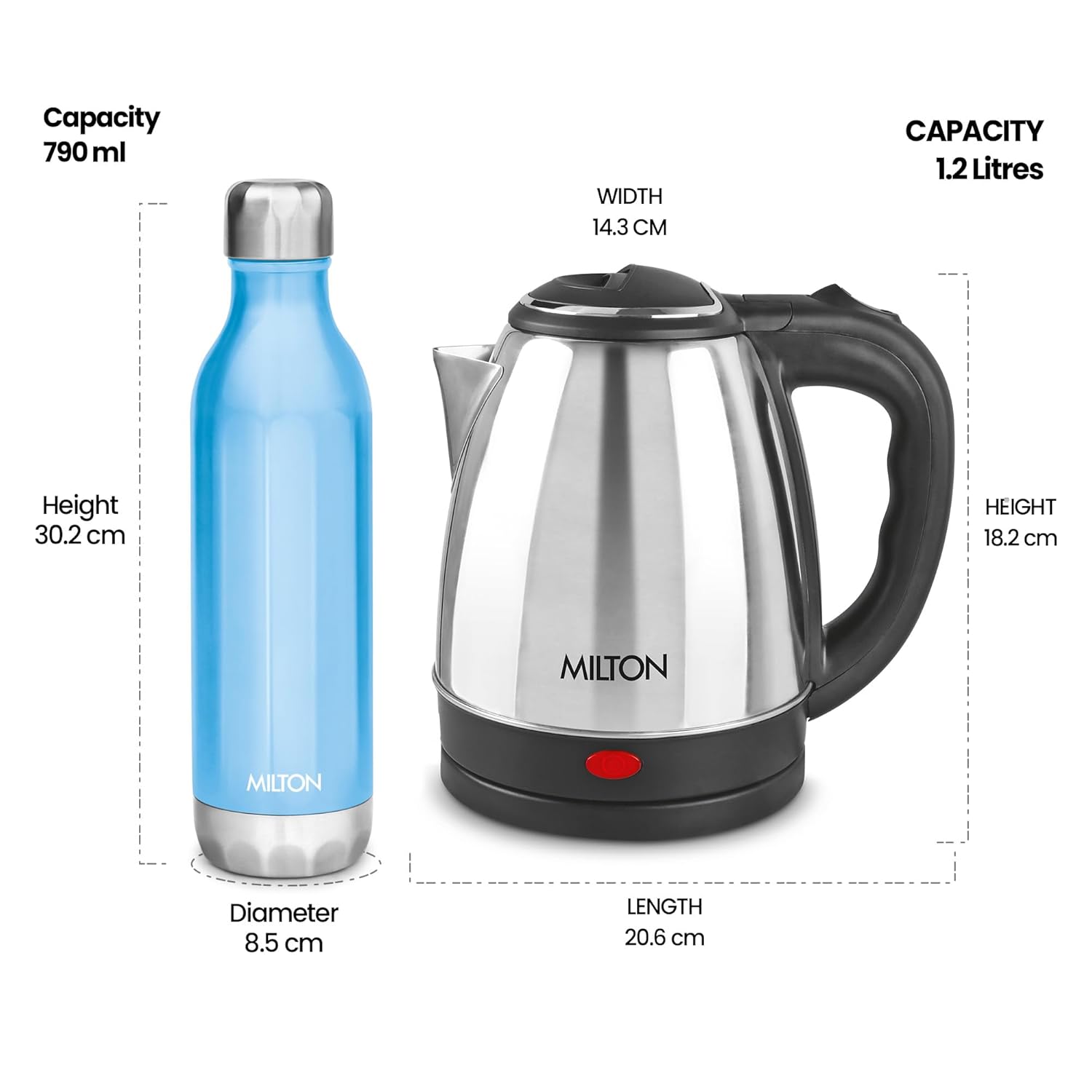 Color: Blue; Material: Stainless Steel; Package Content: 2 – Pieces Combo Set (Go Electro Kettle, 1.2 Litres & Bliss Bottle, Blue, 790 ml); Dimension in cms (L x W x H): Kettle: 20.6 x 14.3 x 18.2 & Bliss Bottle: 8 x 8 x 30