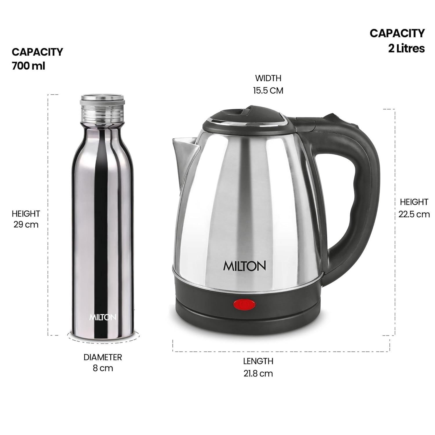 Color: Silver; Material: Stainless Steel; Package Content: 2 – Pieces Combo Set (Go Electro Kettle, 2 Litres & Glitz Bottle, 710 ml); Dimension in cms (L x W x H): Kettle: 21.8 x 15.5 x 22.5 & Glitz Bottle: 7.4 x 7.4 x 28