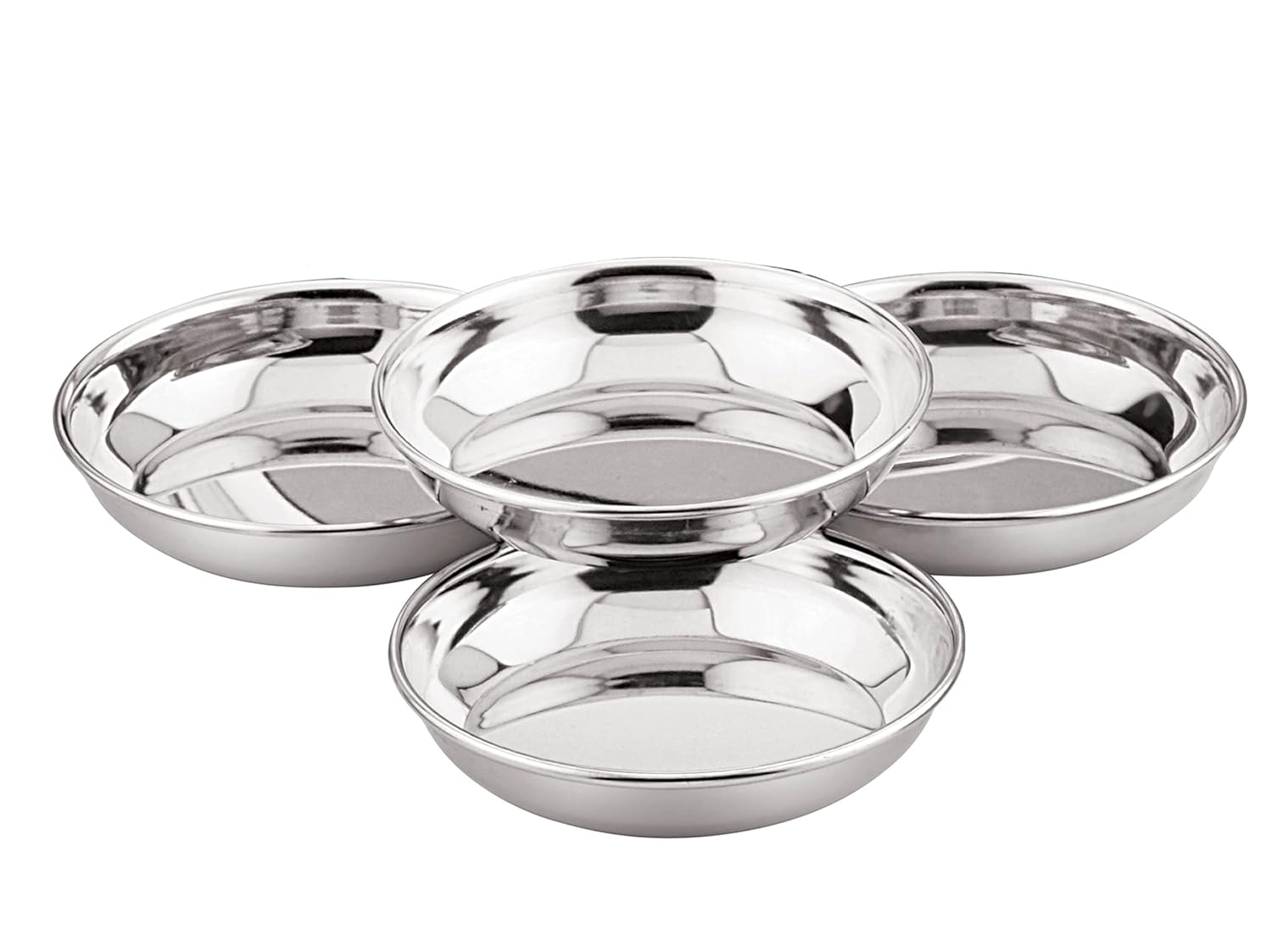 Place this Halwa plate (Pudding dish) in the Dinner Plate and serve Vegetables, Raita, Sweets in this beautifully designed plate to your guest which will give your guests a truly great dining pleasure. Made from very good quality of stainless steel .It is easy to clean and maintain. The outer shape is designed in a way that the food gently flows on the fingers while you lift it from the edges of the plate. The mirror shine will simply make you love the plate once you lays your hands on it.