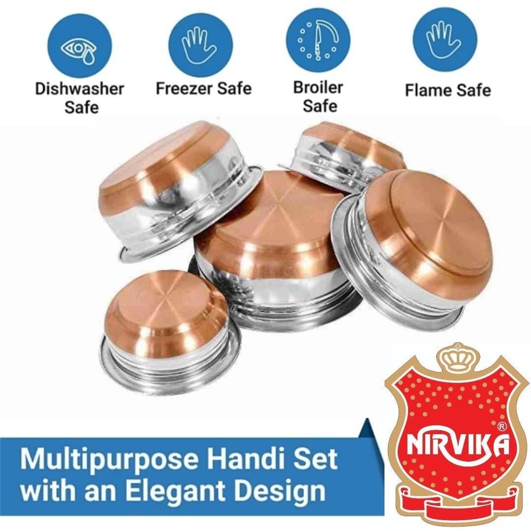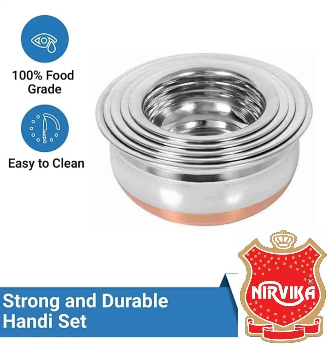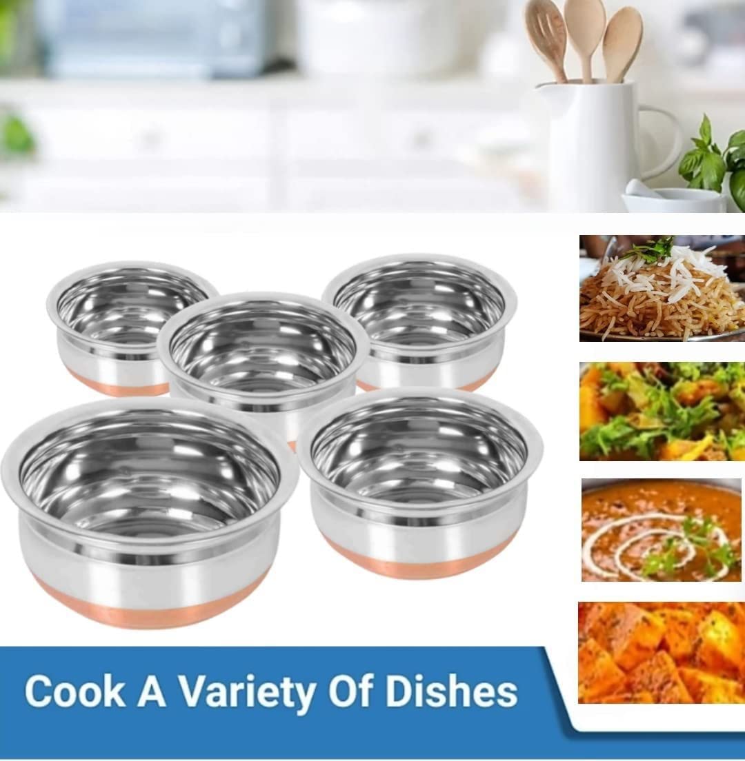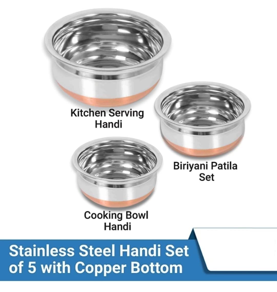 ✅ These handi have enough space for cooking and storing milk, tea, vegetable curries, curd etc. Looks great on the copper bottom, Durable & Heavy Duty, This 5 Pcs.stainless steel handi for cooking