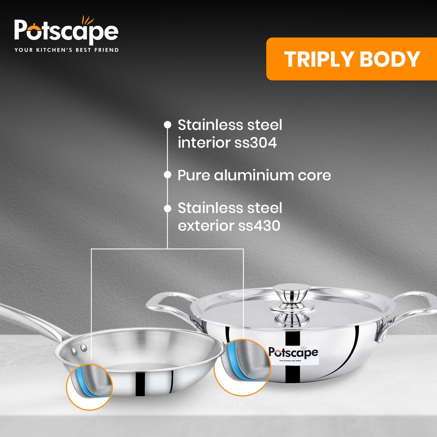 Exquisite Triply Construction: Experience unparalleled heat distribution and retention with our Potscape Triply Cookware Set, a fusion of three superior layers. This ensures your culinary masterpieces cook evenly, preventing hot spots. Enjoy the efficiency and precise cooking of restaurant-quality meals right in your kitchen, turning every meal into a celebration of flavorsome perfection!