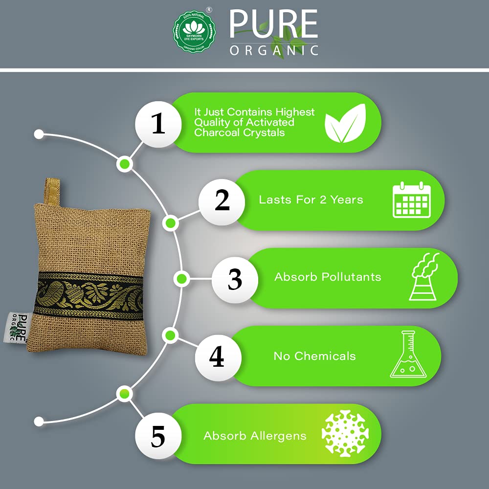 “Pure Organic Charcoal Non-electric air purifier will help your family breathe healthy by naturally absorbing bad smell, moisture, pollutants and allergens. Choose from our four size variants to help purify small spaces like shoe rack, wardrobe, fridge to large spaces live living room and kids room. Pure Organic non-electric air purifier made from the highest quality of activated charcoal. This scentless, non-toxic product is constantly on its job of removing the odors, is pocket-friendly as well, with each bag lasting over one year.