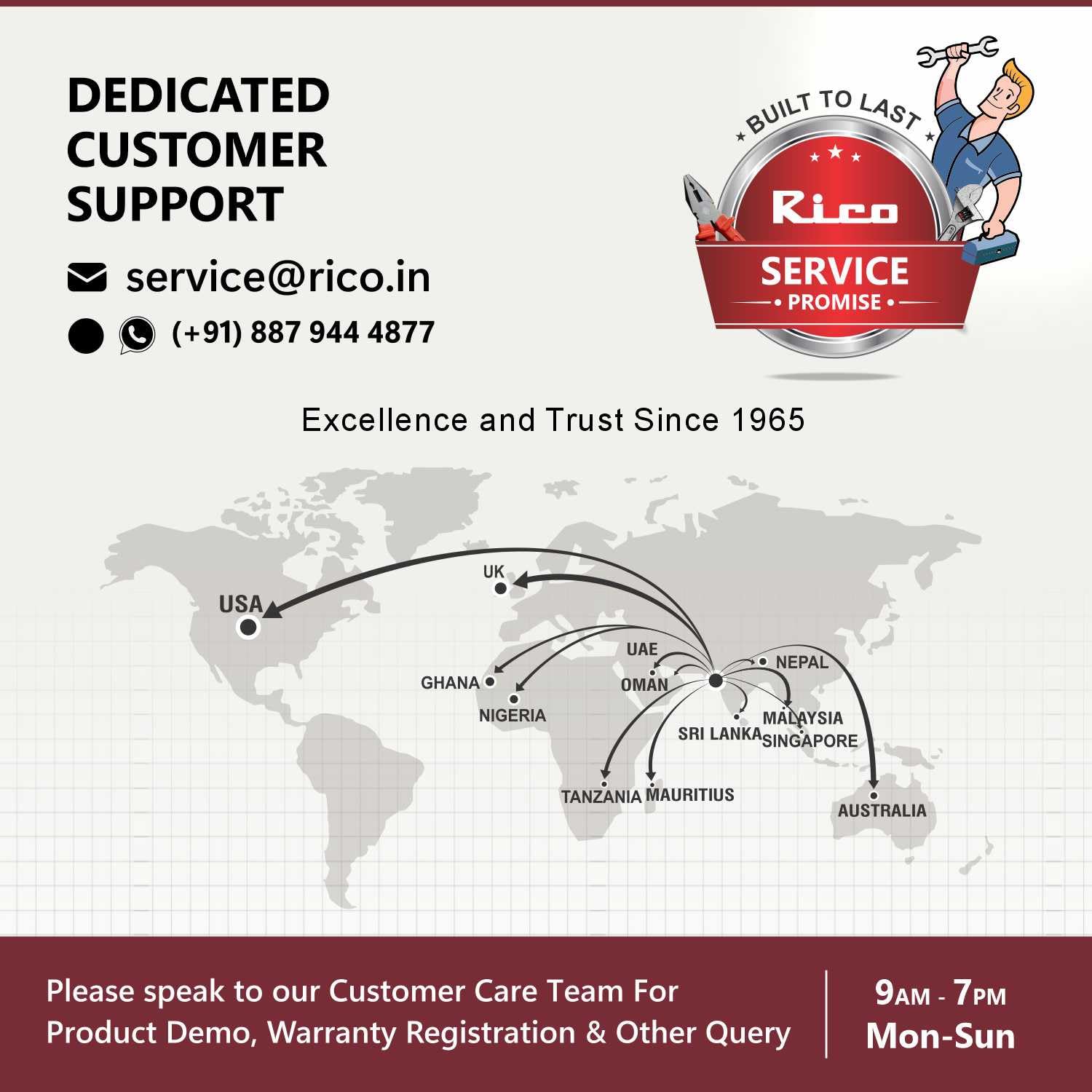 RICO WARRANTY – 2 Year Warranty on the Product and 5 Years Motor Warranty.