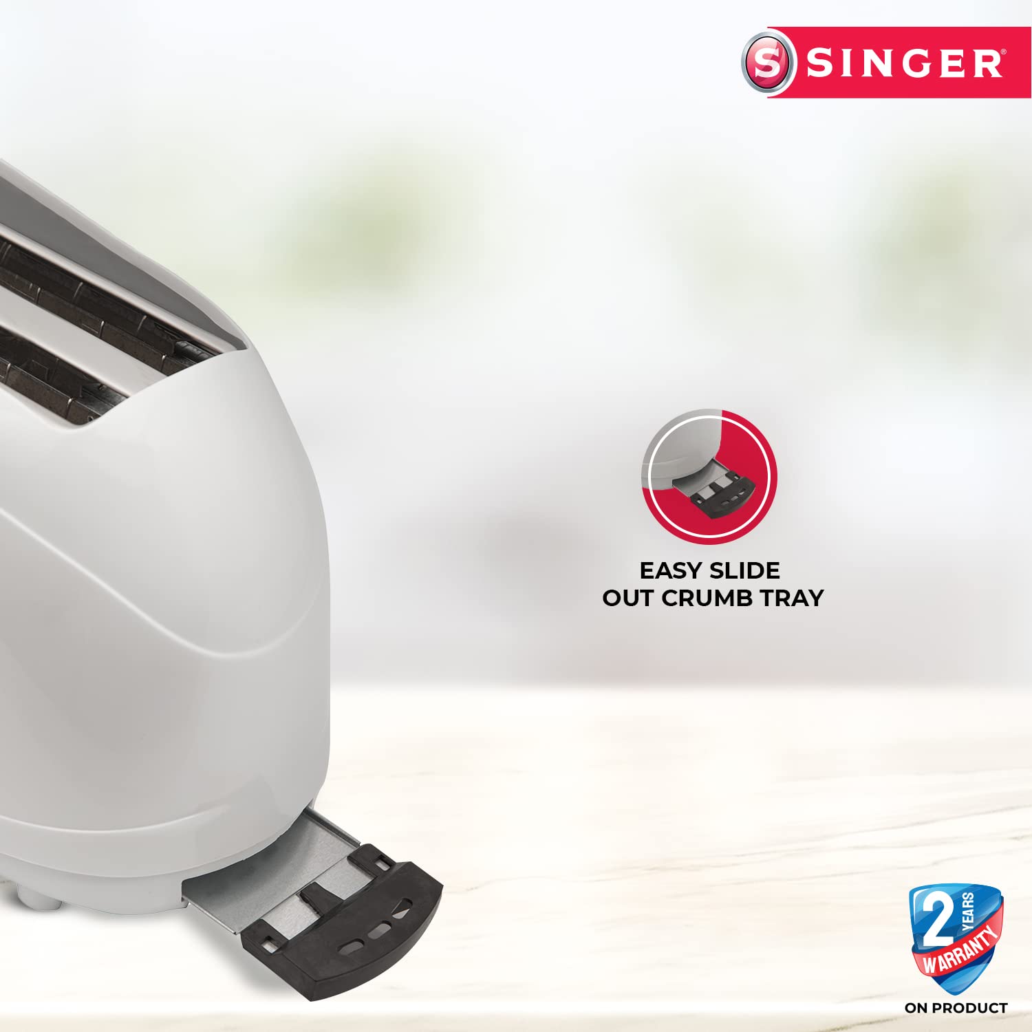 The 2 Slice popup toaster features a convenient crumb tray that easily slides out, making cleanup simple.