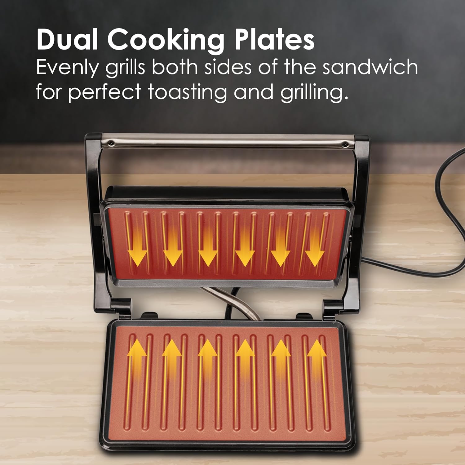 Non-stick plates ensures easy food release & hassle-free cleaning, making perfect for preparing delicious, evenly grilled sandwiches without any mess