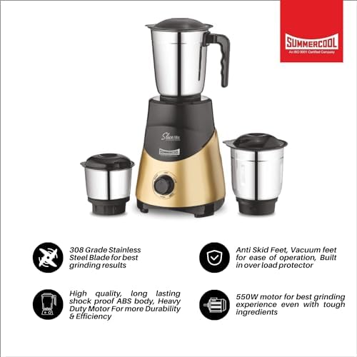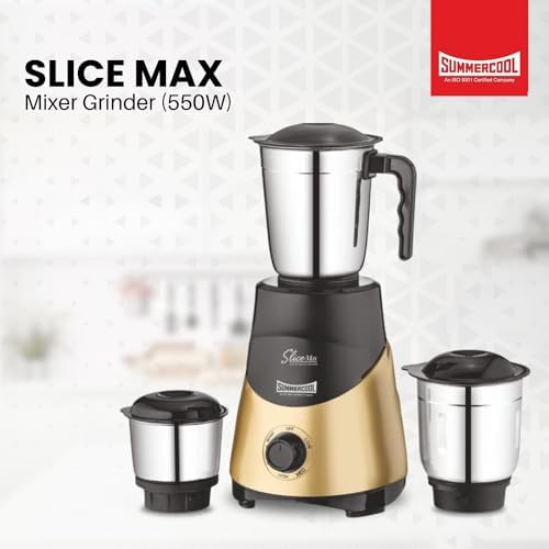 The Summercool Slice Max mixer grinder is a solid durable kitchen appliance for your everyday kitchen use. The jars are made of stainless steel, which along with giving it added strength also prevents rusting. The vacuum feet help the easy operation. It comes with three different stainless-steel jars that allow versatile operations in the kitchen so that it can be used for multiple purposes.