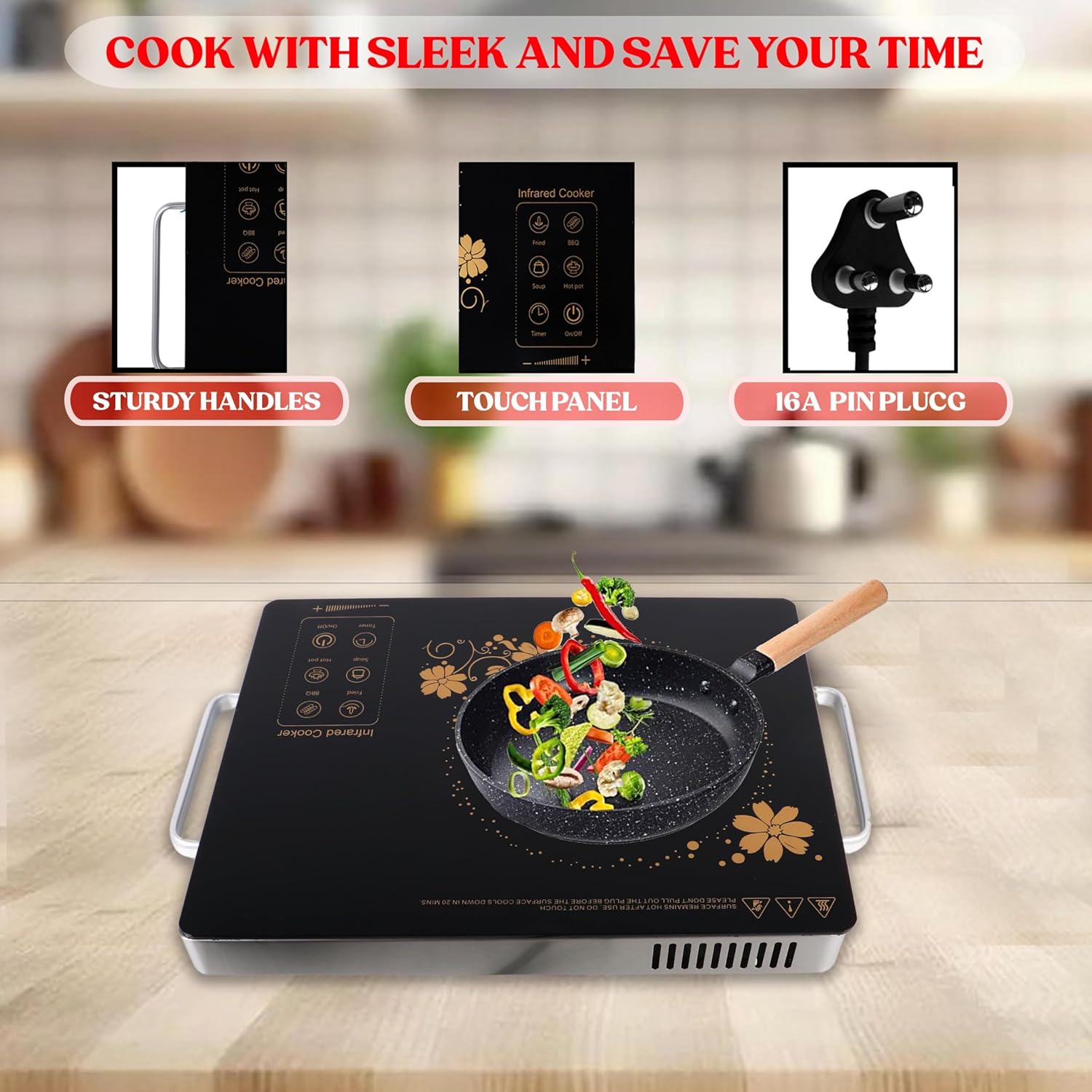 Cook smarter and faster with this powerful 2200-watt Infra Induction Cooktop. Designed for modern kitchens, this induction stove offers rapid heating with precise temperature control, ensuring efficient and safe cooking. Its infrared technology allows for uniform heat distribution, making it suitable for all types of cookware, including steel, aluminum, and glass. The sleek, portable design and user-friendly touch panel make it a perfect fit for any home or small kitchen space.