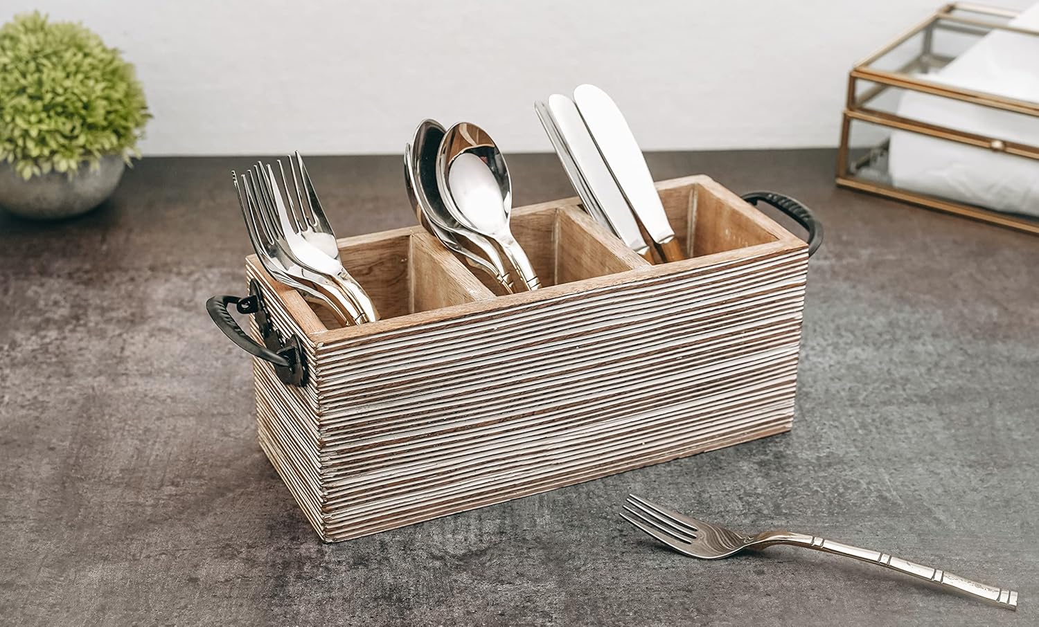 SIZE: No assembly needed, Measures L 25CM x W 10cm x H x 13cm, Provides plenty of room for all your cookware or cutlery. This wooden cutlery has 3 separate compartments for Knives, spoon, fork, Skimmers, Peelers, Bottle Openers, Silverware or any other kitchen gadget you want neatly in place.