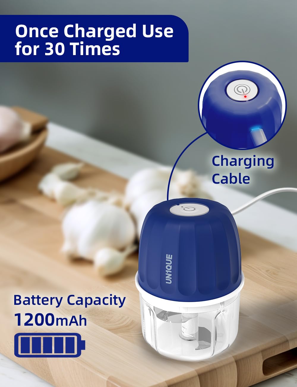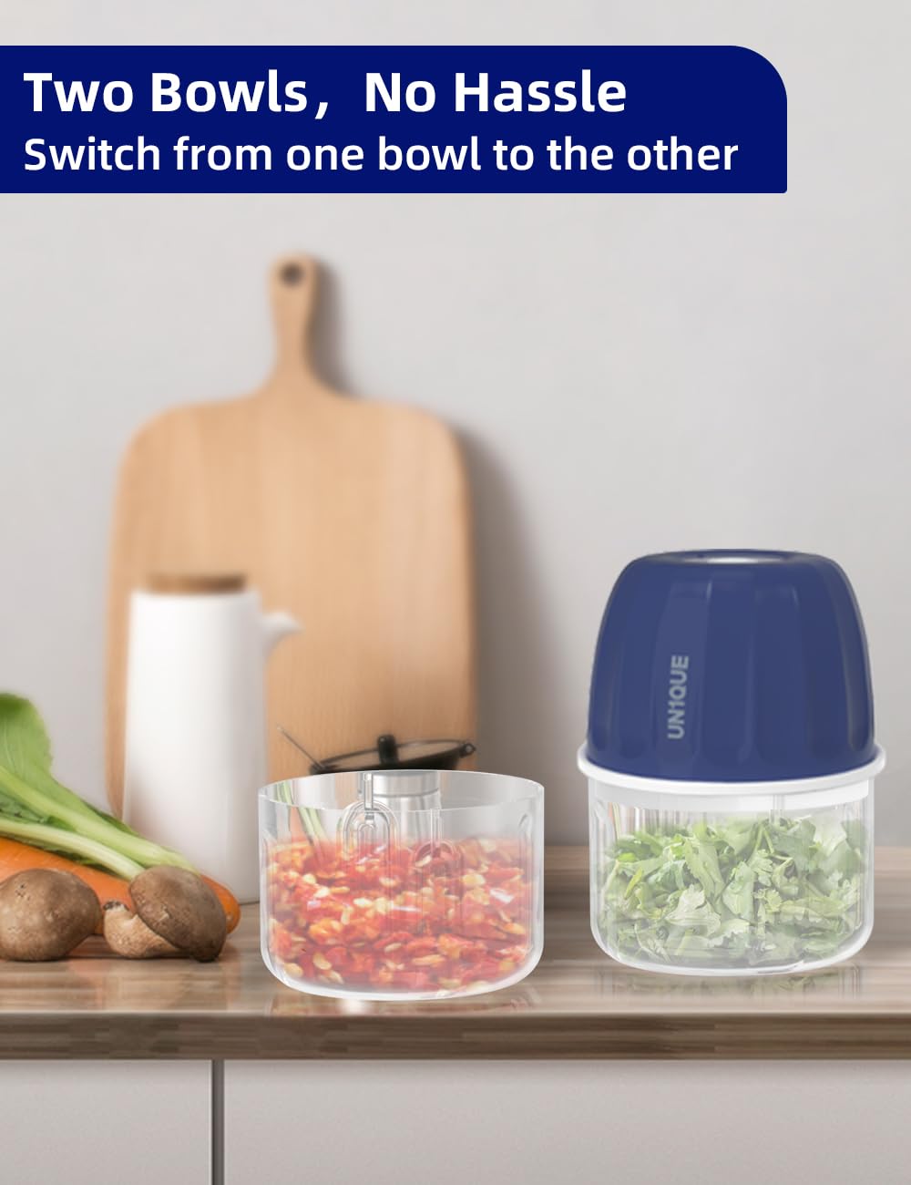 UN1QUE Rechargeable Mini Electric Chopper for Kicthen | One-Touch Operation | 2 Bowls= 500ML | 304 Stainless Steel Blades | Chopper Electric for Chop, Mince, Puree, Whisk, Grind (Blue)
