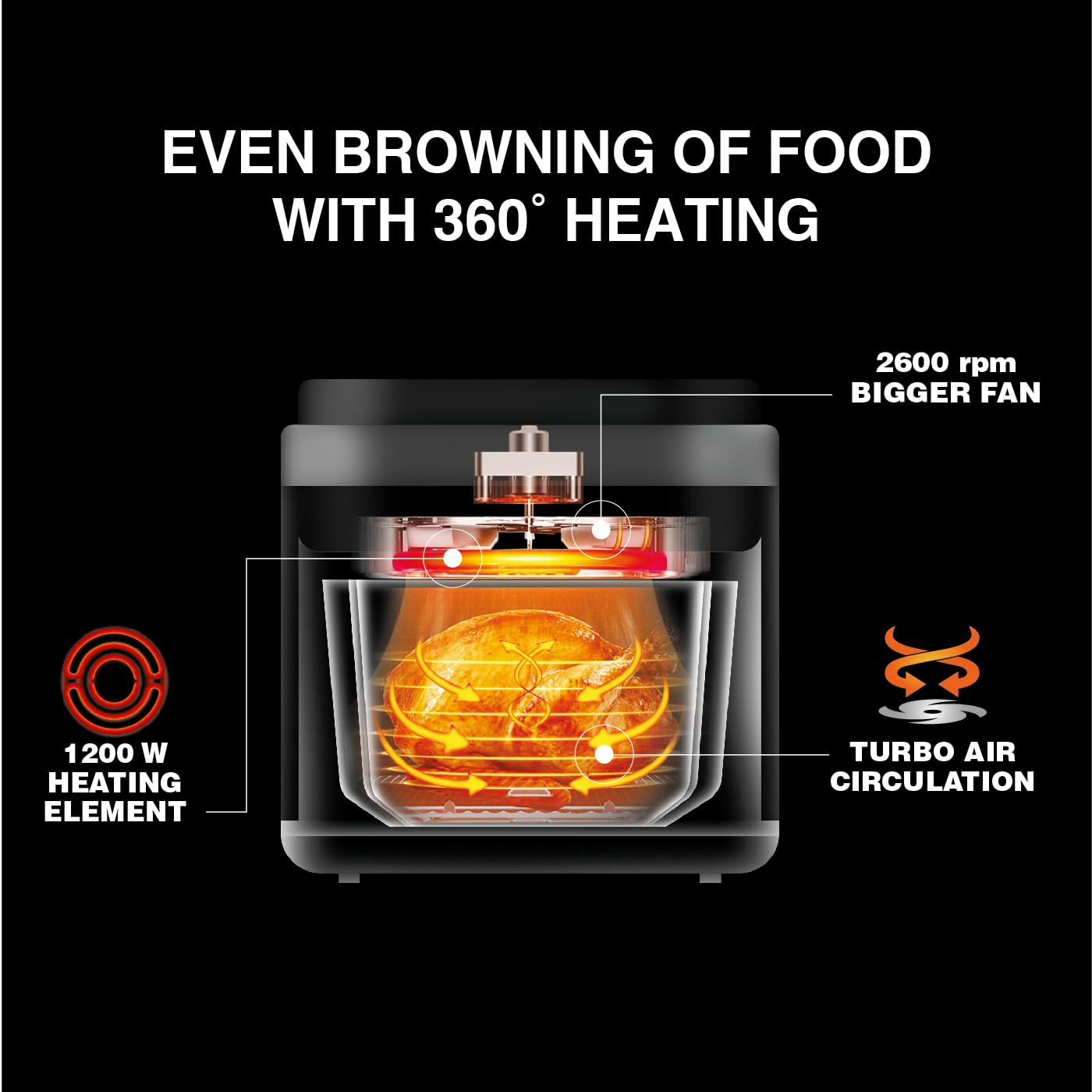 Turbo air circulation: Triggers the Maillard reaction which facilitates the golden brown, crispy textured outside and scrumptious juiciness inside with little or no oil, Operating and adjustable temperature range 40°C – 200°C and timer range 1 minute – 60 minutes