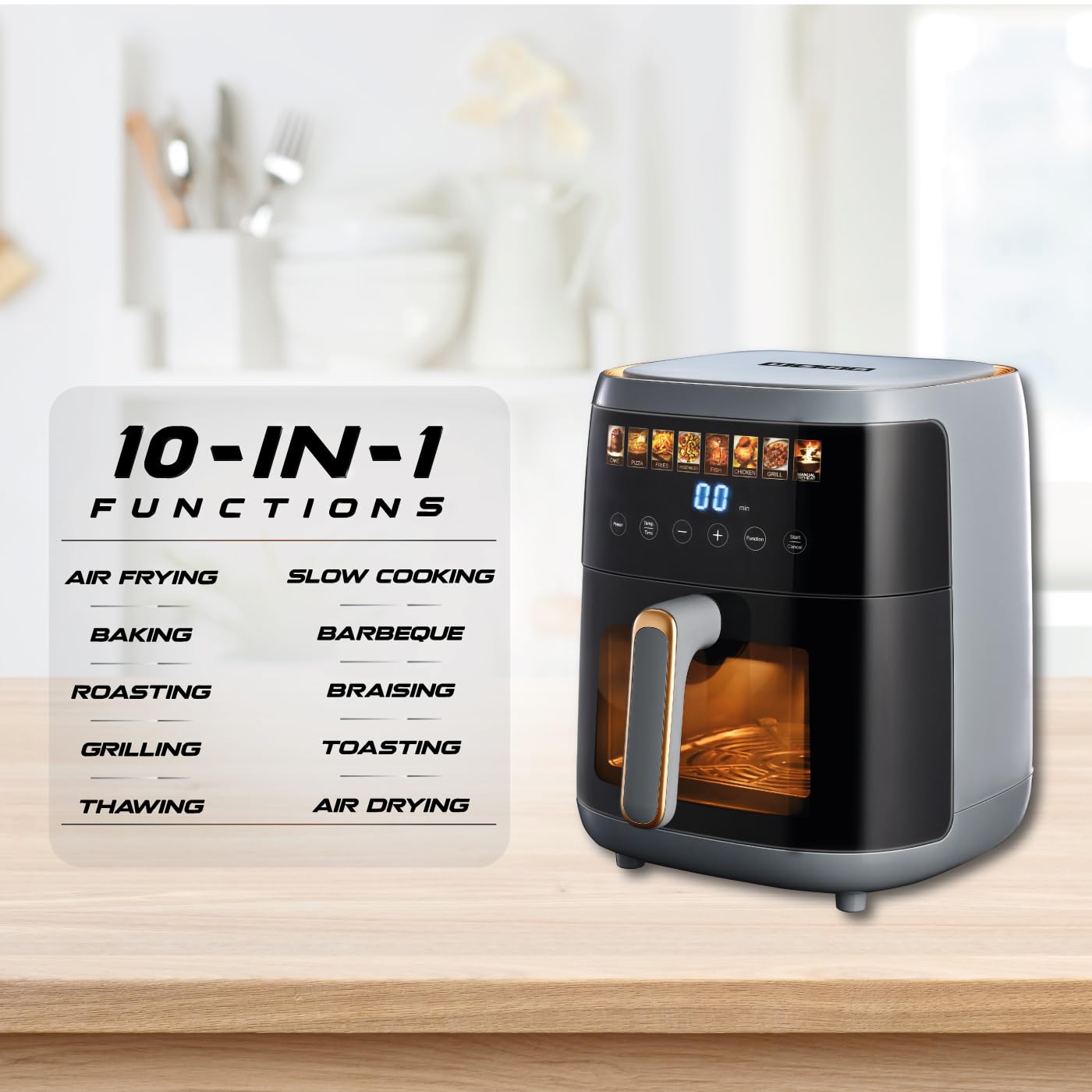 10 in 1 Functions: Air frying, Baking, Roasting, Grilling, Thawing, Slow cooking, Barbeque, Braising, Toasting and Air drying