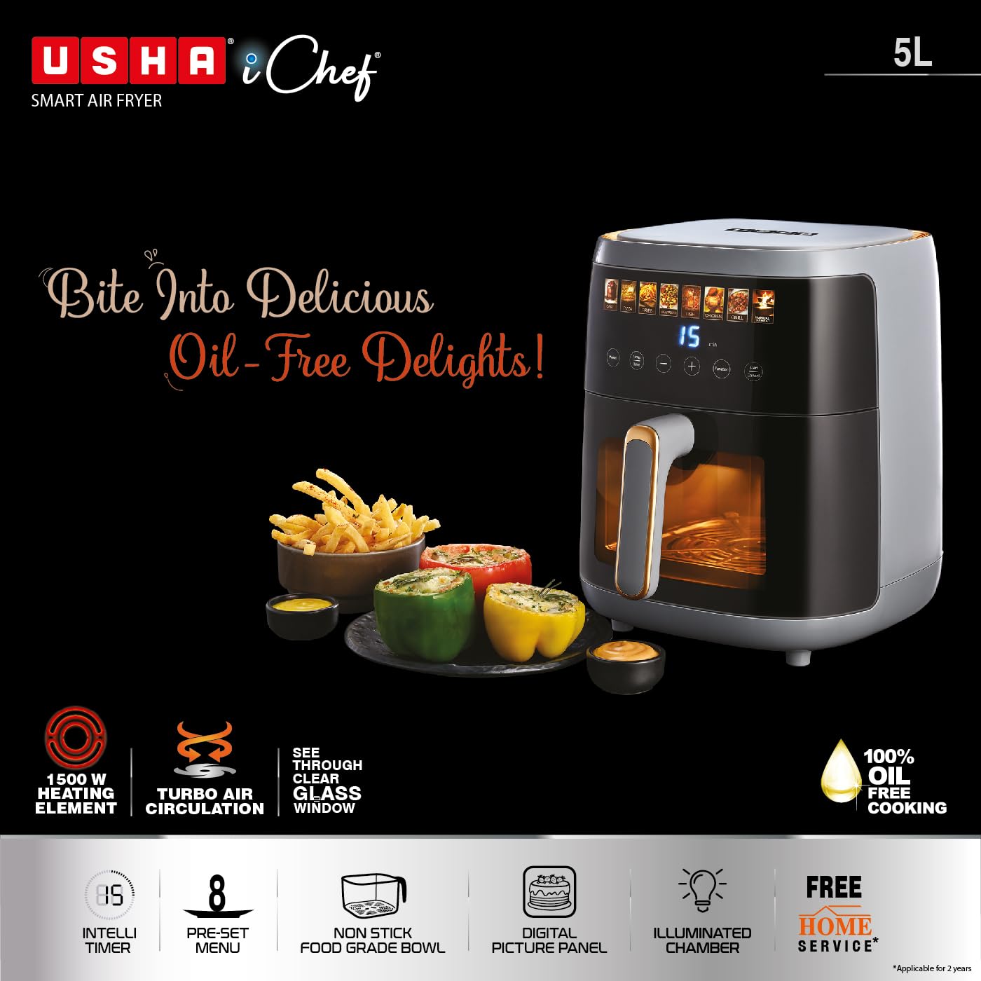 8 Preset Menu with easy adjustment of time and temperature (Cake, Pizza, Fries, Vegetables, Fish, Chicken, Grill with a Reheat option for convenience), Digital display, Illuminated chamber, 100% oil free cooking, 5 L Capacity, 1500 W heating element