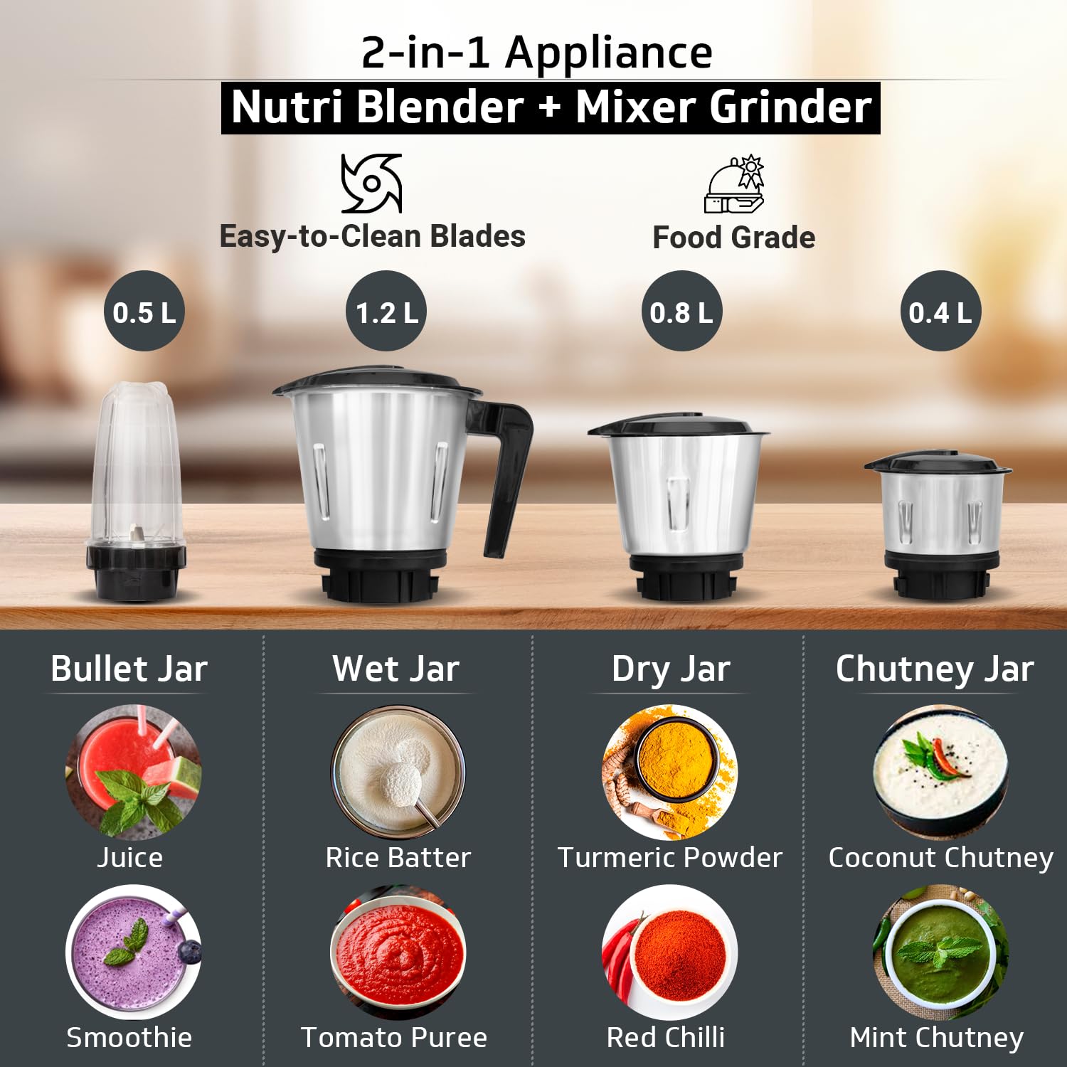 4 MULTIFUNCTIONAL JARS – Bullet, Wet, Dry and Chutney Jar – designed to handle all your juicing, blending, and grinding needs for everyday culinary convenience. The Bullet Jar is perfect for refreshing juices and smoothies and comes with a sipper lid for on-the-go ease. The Wet Jar is ideal for preparing smooth batters like dosa batter, the Dry Jar efficiently grinds spices such as red chili and garam masala, and the Chutney Jar is perfect for making flavourful chutneys like coriander and coconut.