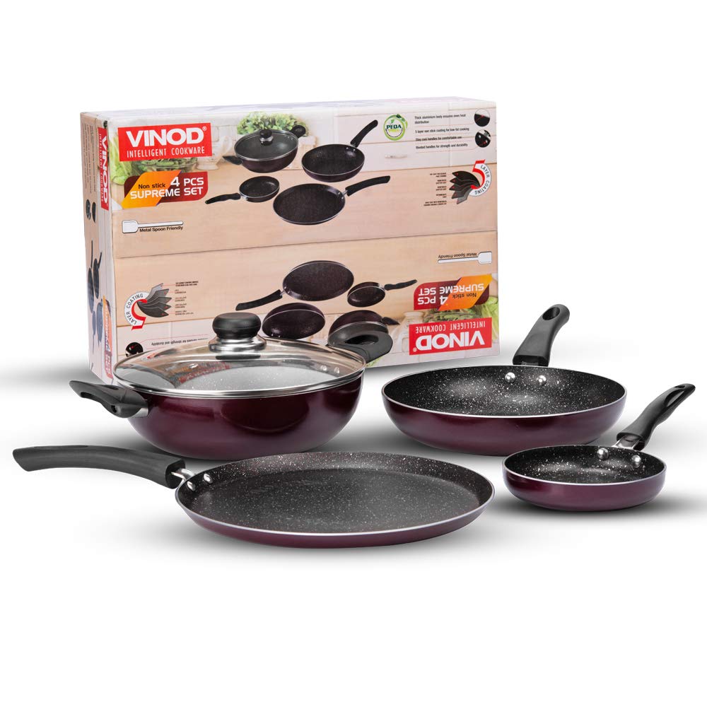 Vinod’s non-stick Supreme Kitchen set is designed to deliver premium quality and great value to you. This cookware set comes with 1 non-stick Fry Pan, 1 non-stick Kadai,1 Non-stick Flat Dosa Tawa, 1 Non-stick mini fry pan, and one glass lid which can be used on the kadai as well as the frypan.