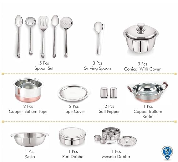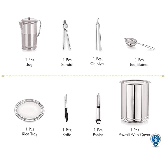 2-Piece Salt & Pepper, 1-Piece Kadai Copper Bottom, 1-Piece Basin/ Parat, 1-Piece Pawali with Lid, 1-Piece Puri Dabba, 1-Piece Masala Dabba, 1-Piece Jug, 1-Piece Sandsi, 1-Piece Chipiya, 1-Piece Rice Tray, 1-Piece Tea Strainer, 1-Piece Peeler, 1-Piece Knife.